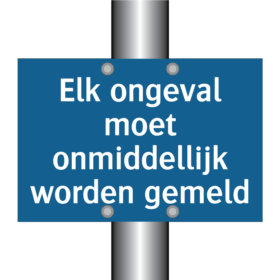 Verplichte bord met de tekst Elk ongeval moet onmiddellijk worden gemeld