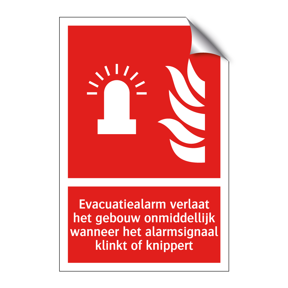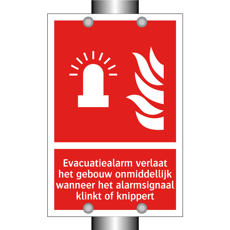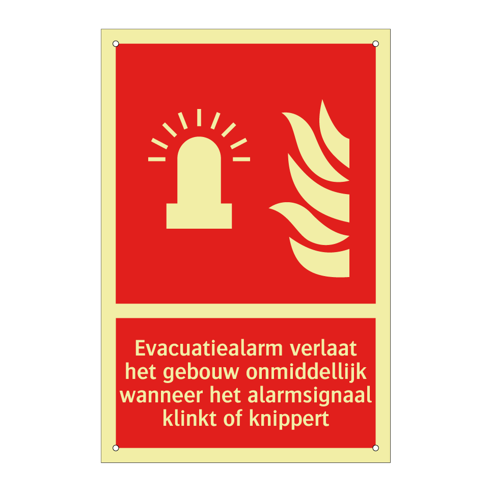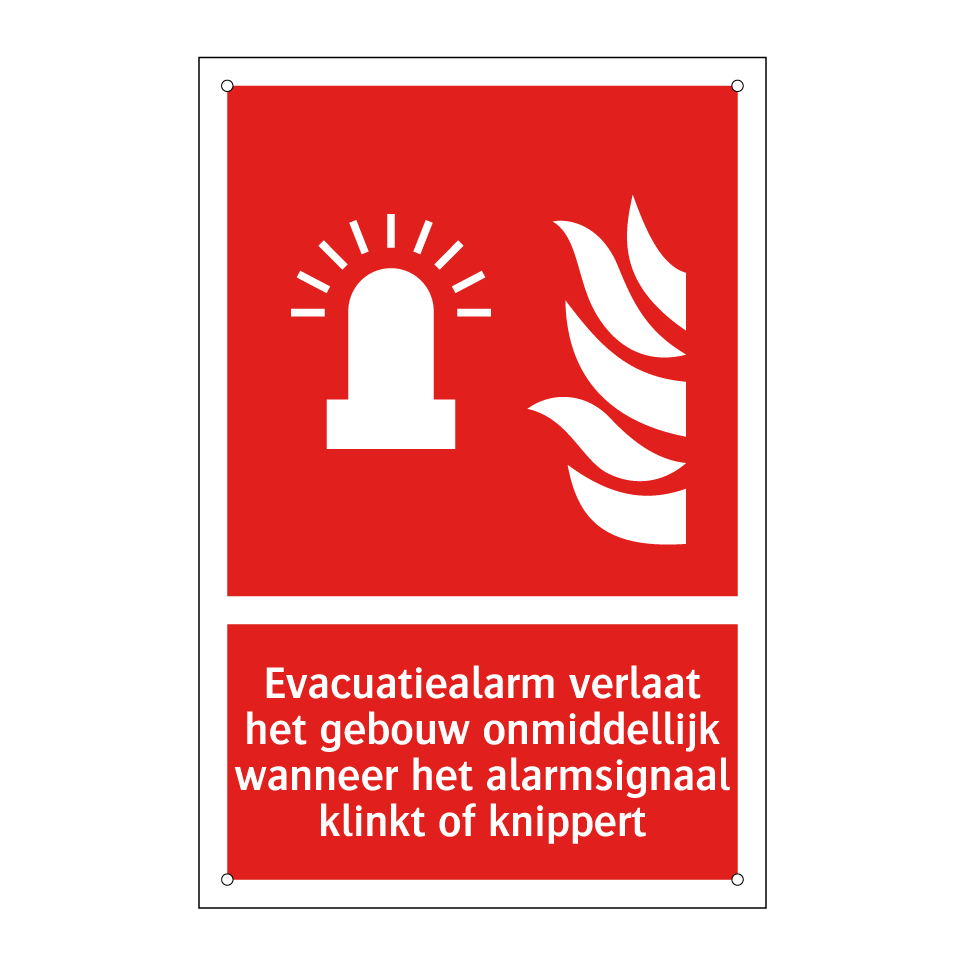 Brandbord met tekst Evacuatiealarm verlaat het gebouw onmiddellijk wanneer het alarmsignaal klinkt of knippert