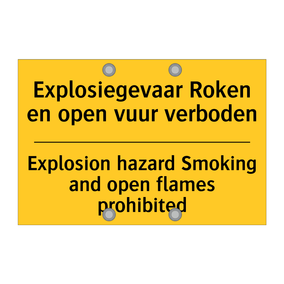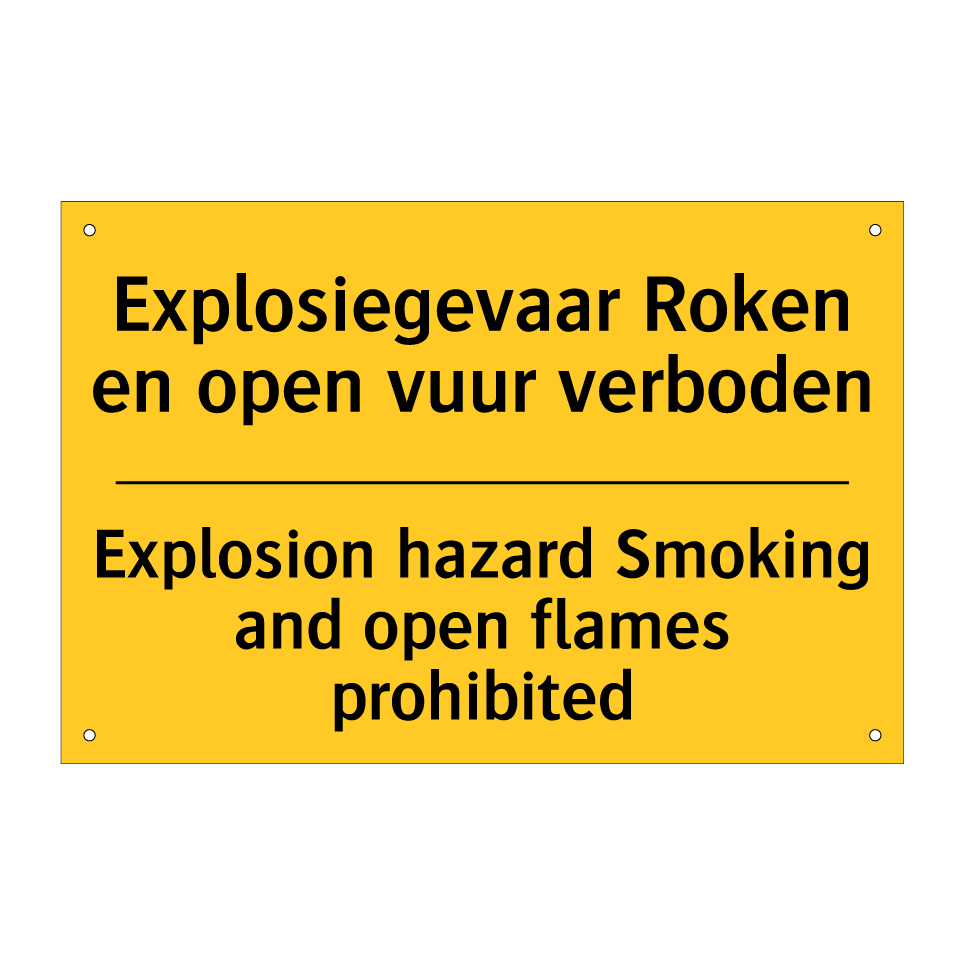 Dit waarschuwingsbord met gele achtergrond en zwarte tekst is ideaal voor het markeren van gevaarlijke zones waar explosiegevaar aanwezig is. De tweetalige tekst, in zowel Nederlands als Engels, zorgt ervoor dat de boodschap duidelijk is voor een breder publiek, wat de veiligheid verhoogt. Dit bordje is perfect voor gebruik in industriële omgevingen, laboratoria, opslagruimtes en andere gebieden waar ontvlambare materialen worden gebruikt. Door het strategisch te plaatsen bij ingangen, werkstations en opslagruimtes, helpt dit waarschuwingsbord om werknemers en bezoekers te waarschuwen voor de risico's van roken en open vuur in de buurt van explosieve stoffen.