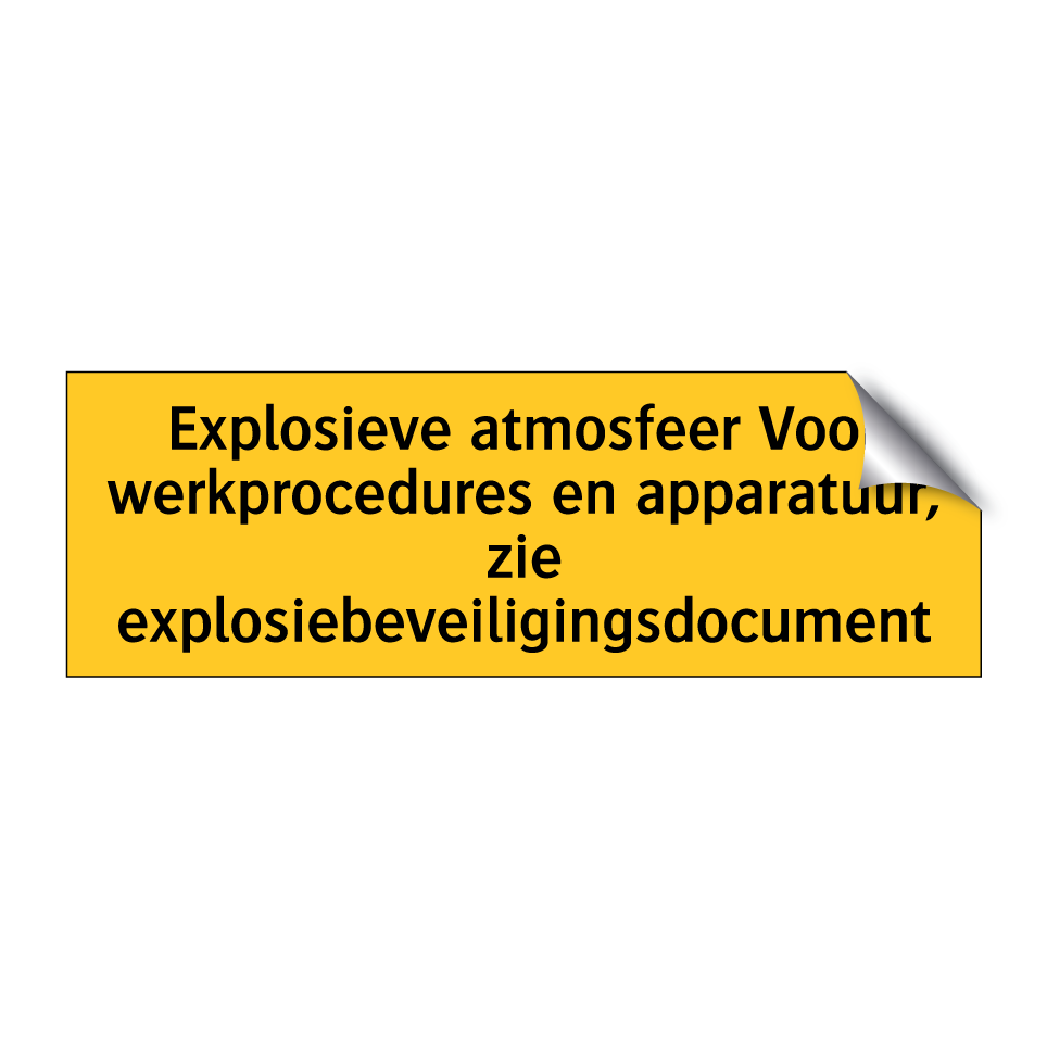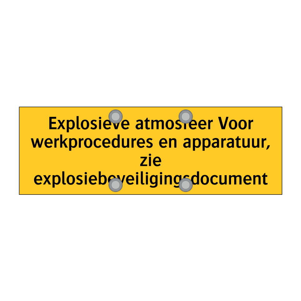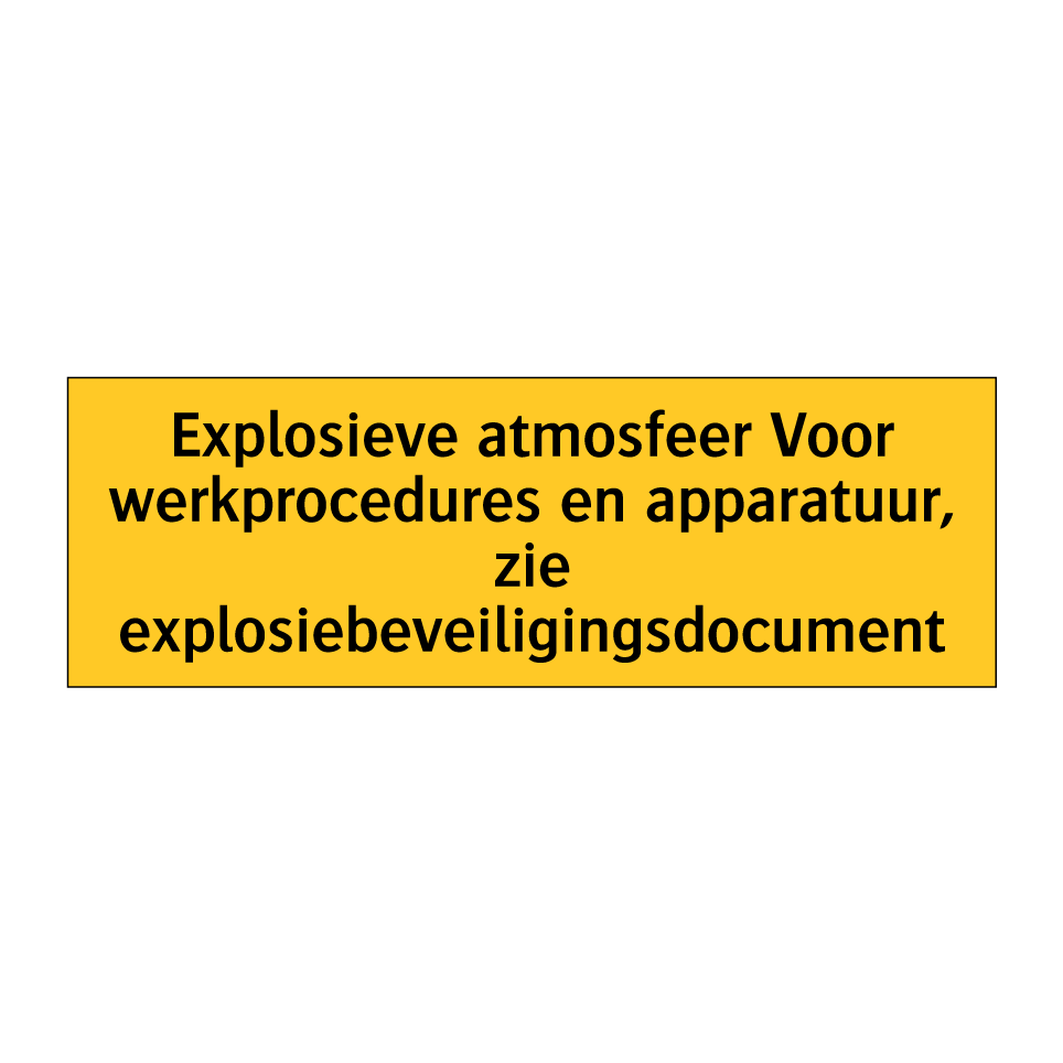 Waarschuwingsbord met de tekst Explosieve atmosfeer Voor werkprocedures en apparatuur, zie explosiebeveiligingsdocument