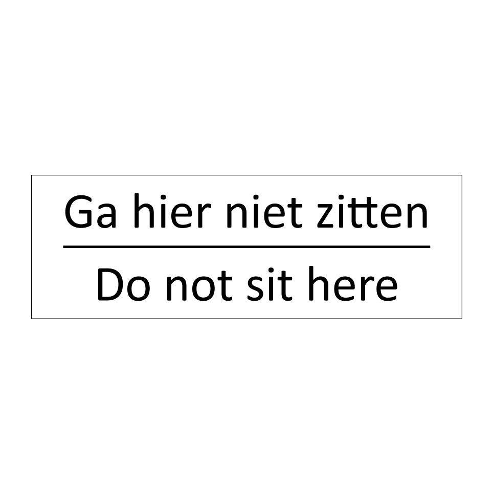 Informatiebord met tekst in het nederlands en engels. Dit bord luidt: Ga hier niet zitten evenals met de engelse vertaling Do not sit here.