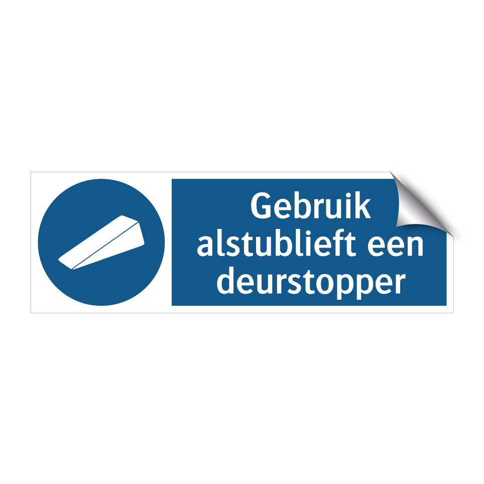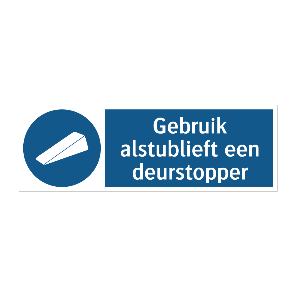 Ideaal voor gebruik in kantoren, magazijnen en andere werkruimtes, helpt deze verplichte bord om de veiligheid en efficiëntie te verbeteren. Door het gebruik van een deurstopper te promoten, voorkomt u onnodige schade aan deuren en muren. Plaats deze bord bij ingangen, gangen of andere strategische locaties waar deuren vaak geopend en gesloten worden. Dit bordje is een essentiële toevoeging voor elke ruimte waar het belangrijk is om deuren correct te gebruiken en te beschermen. Zorg voor een georganiseerde en veilige omgeving door deze duidelijke en effectieve boodschap te communiceren.
