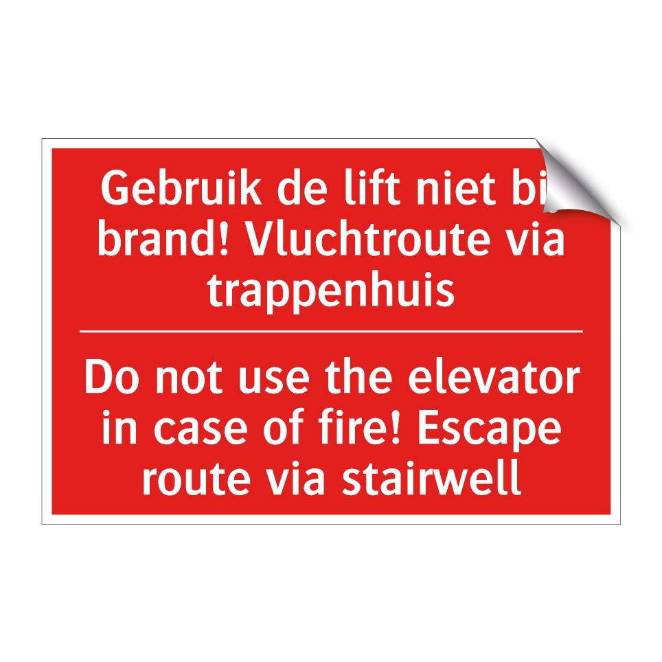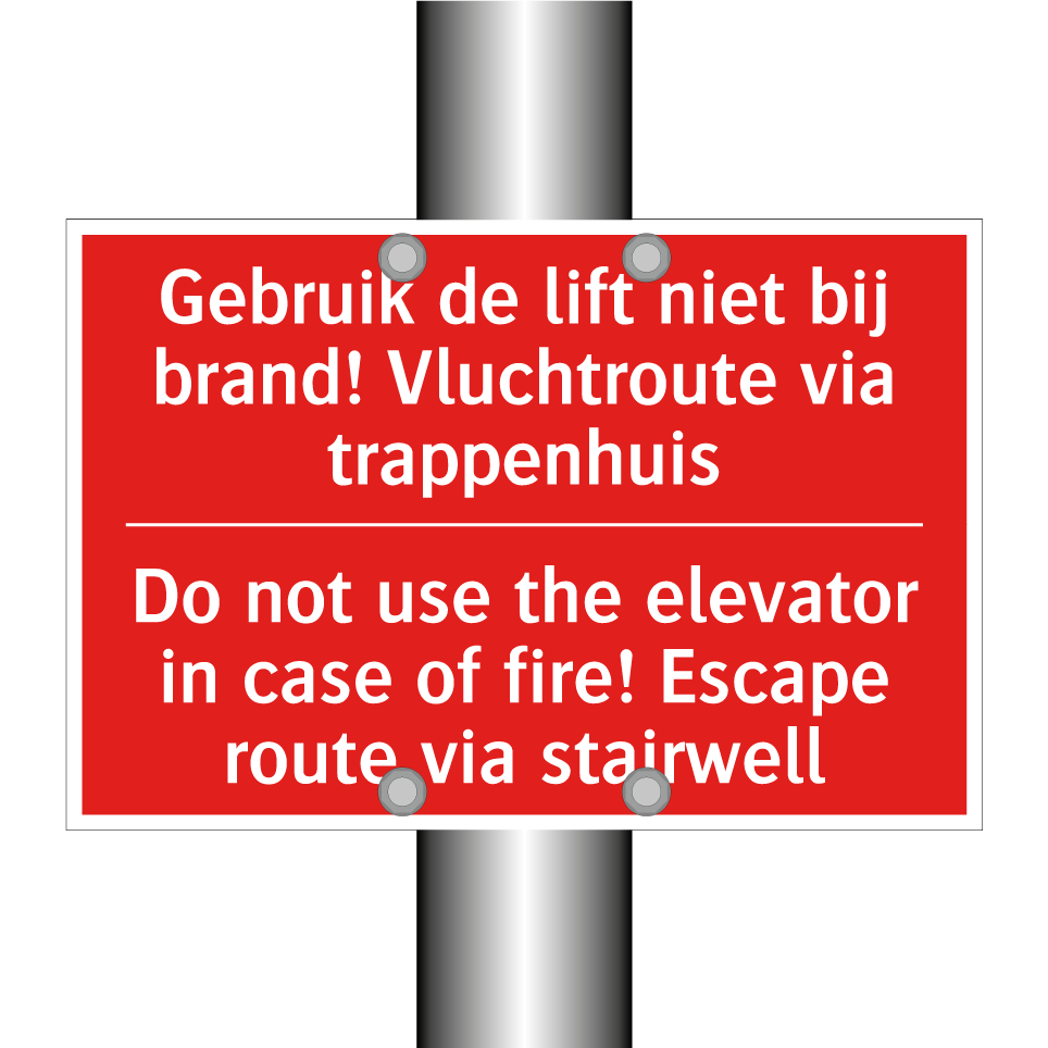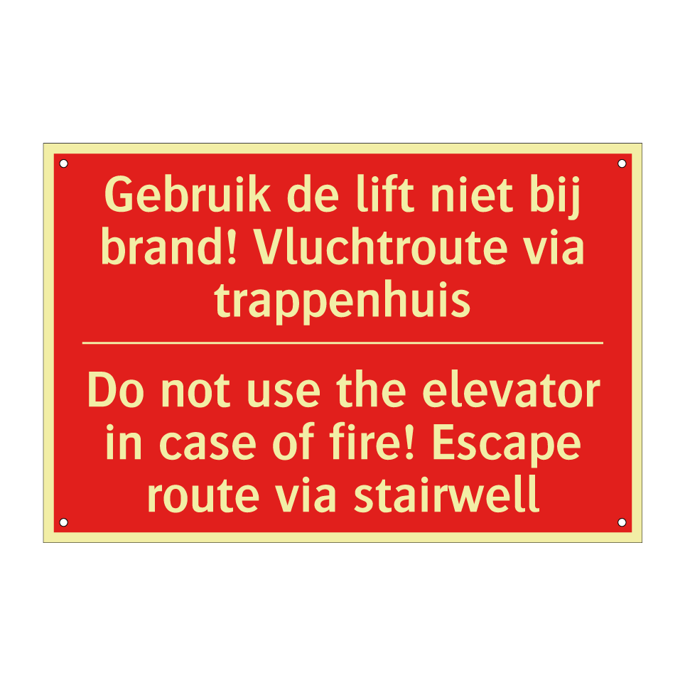 Brandbord met tekst Gebruik de lift niet bij brand! Vluchtroute via trappenhuis - Do not use the elevator in case of fire! Escape route via stairwell