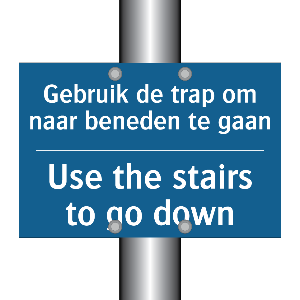 Verplichte bord met de tekst Gebruik de trap om naar beneden te gaan - Use the stairs to go down