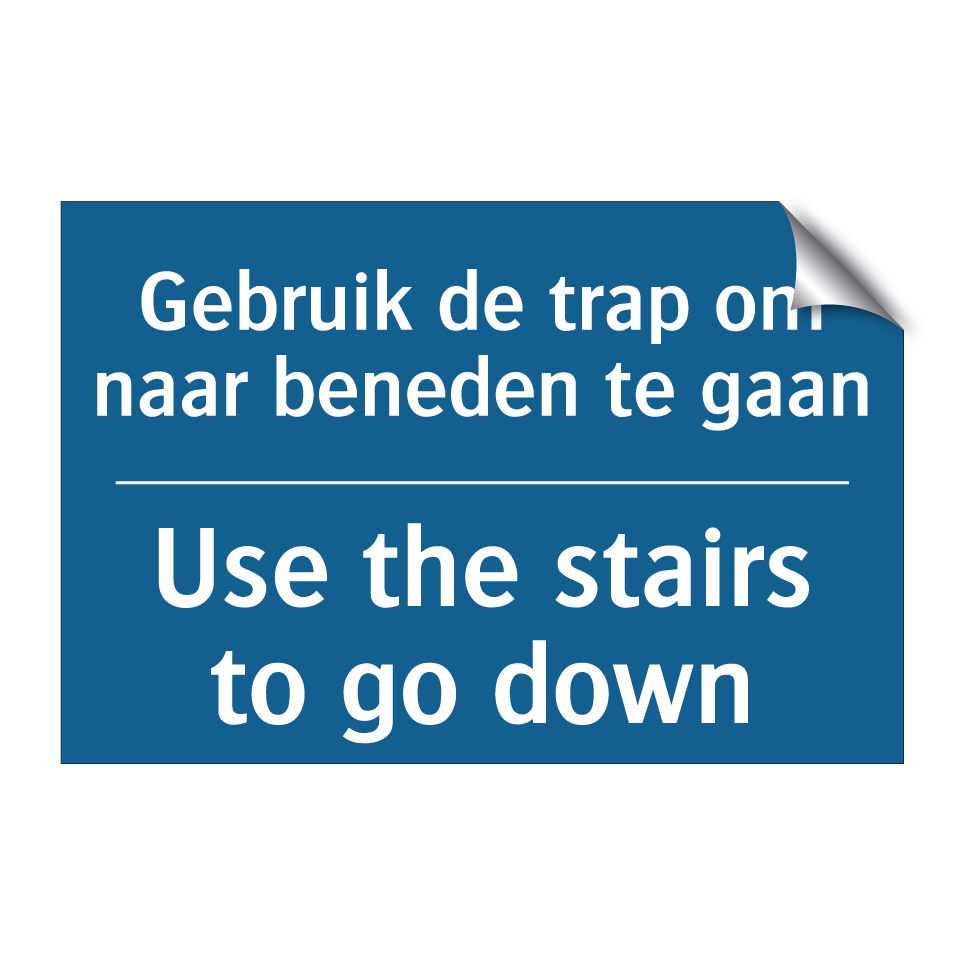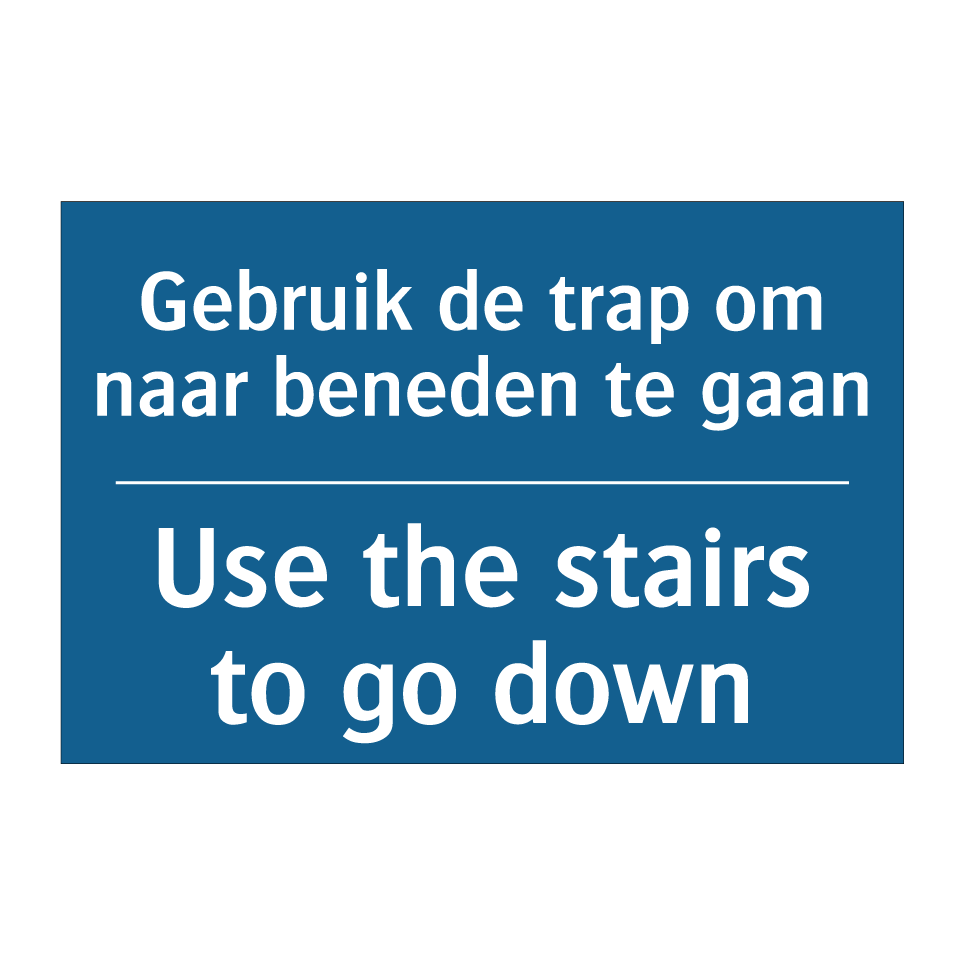 Deze verplichte bord is ideaal voor het bevorderen van veiligheid en efficiëntie in gebouwen. Met een duidelijke boodschap in zowel het Nederlands als het Engels, is deze bord perfect voor internationale omgevingen zoals luchthavens, kantoren en openbare instellingen. Het moedigt mensen aan om de trap te gebruiken om naar beneden te gaan, wat kan helpen om de druk op liften te verminderen en de doorstroming van voetgangers te verbeteren. Plaats deze bord bij trappenhuizen, gangen of andere strategische locaties waar het belangrijk is om voetgangersstromen te reguleren. De tweetalige tekst zorgt ervoor dat de boodschap voor een breder publiek toegankelijk is, wat de effectiviteit van de communicatie verhoogt.