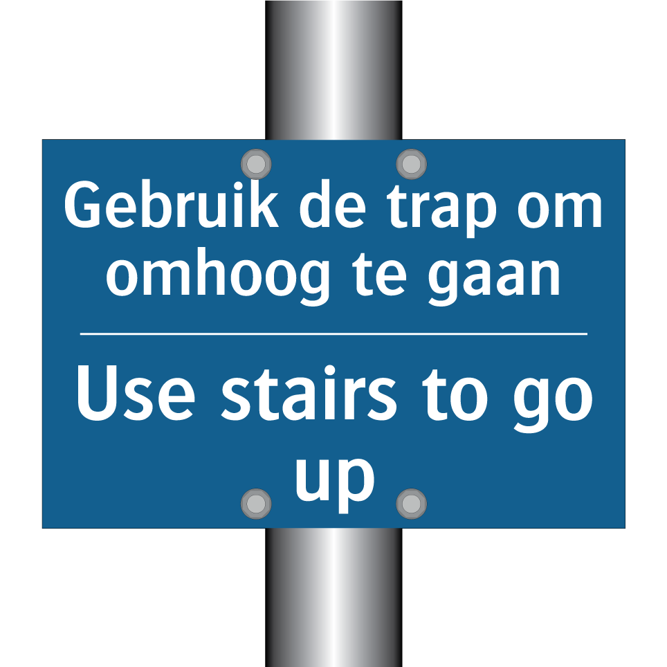 Verplichte bord met de tekst Gebruik de trap om omhoog te gaan - Use stairs to go up