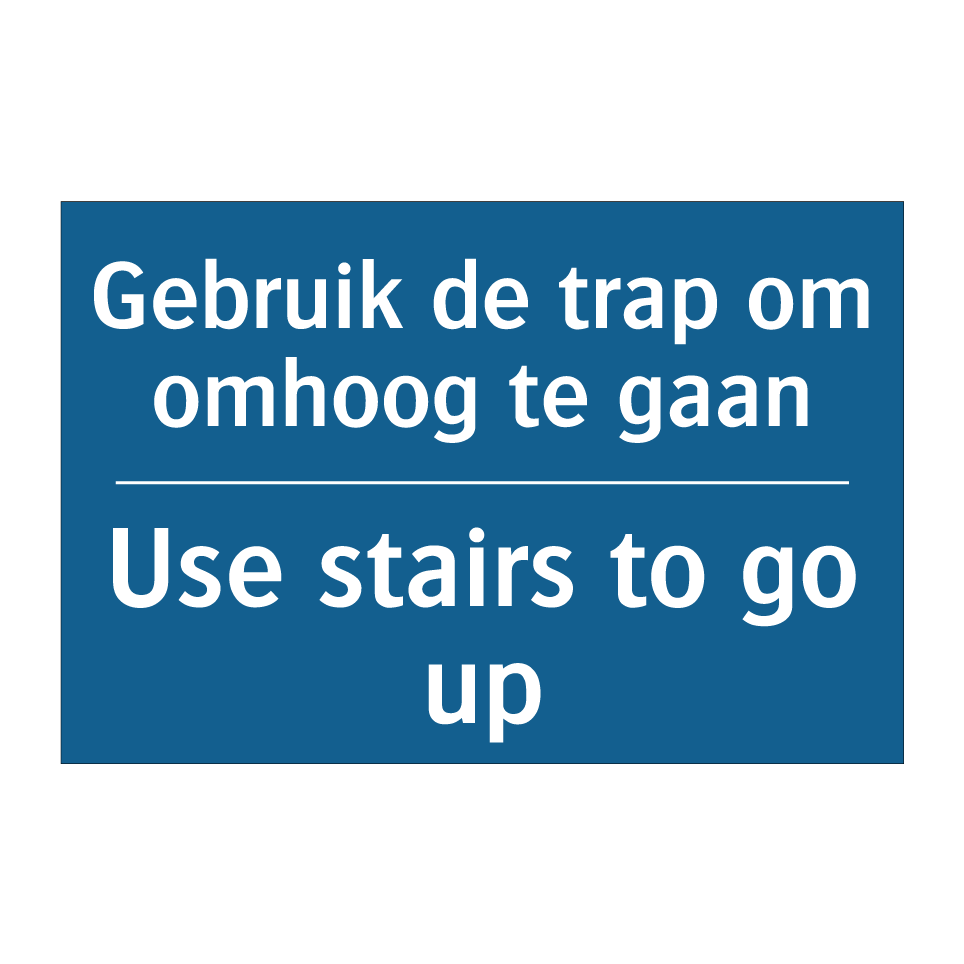 Deze verplichte bord is ideaal voor het bevorderen van veiligheid en efficiëntie in gebouwen. Met een duidelijke boodschap in zowel het Nederlands als het Engels, is deze bord perfect voor internationale omgevingen zoals luchthavens, kantoren en openbare instellingen. Het moedigt mensen aan om de trap te gebruiken om naar boven te gaan, wat kan helpen om drukte bij liften te verminderen en een vlotte doorstroming van voetgangers te bevorderen. Door de tweetalige tekst is het toegankelijk voor een breder publiek, wat de communicatie verbetert en misverstanden voorkomt. Plaats deze verplichte bord op strategische locaties zoals trappenhuizen en ingangen om de boodschap effectief over te brengen.