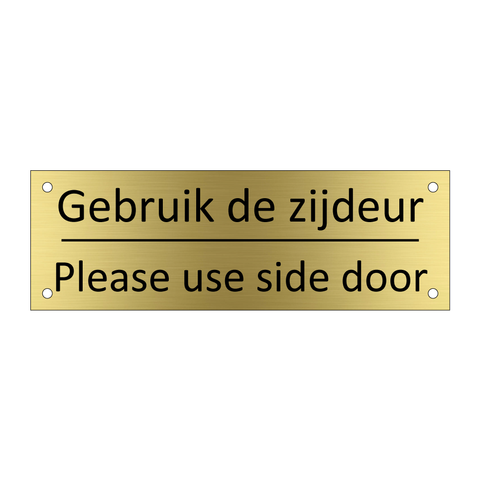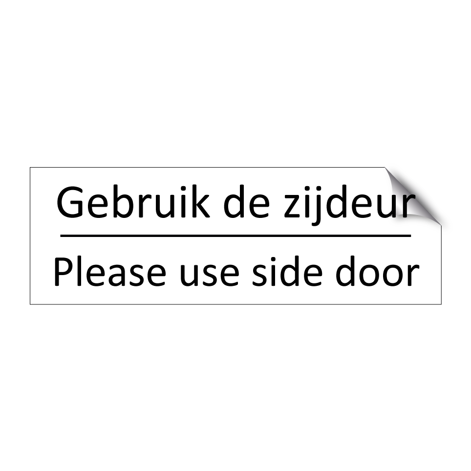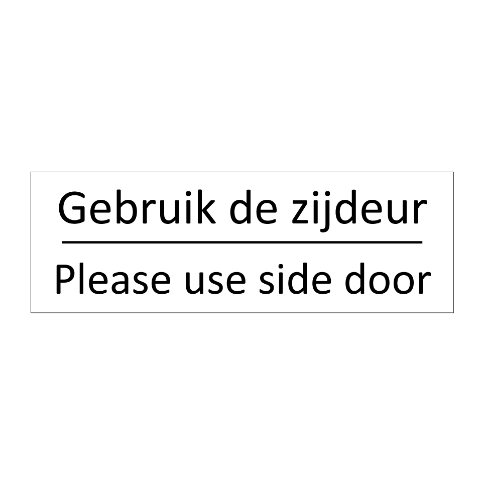 Informatiebord met tekst in het nederlands en engels. Dit bord luidt: Gebruik de zijdeur evenals met de engelse vertaling Please use side door.