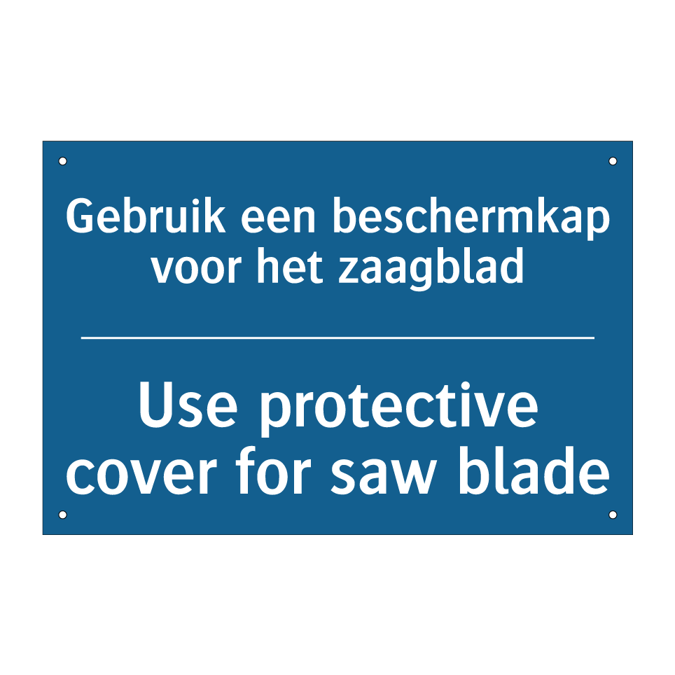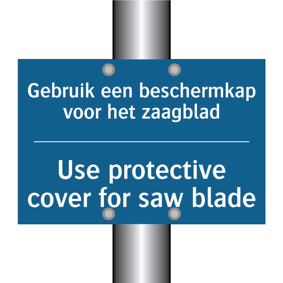 Verplichte bord met de tekst Gebruik een beschermkap voor het zaagblad - Use protective cover for saw blade