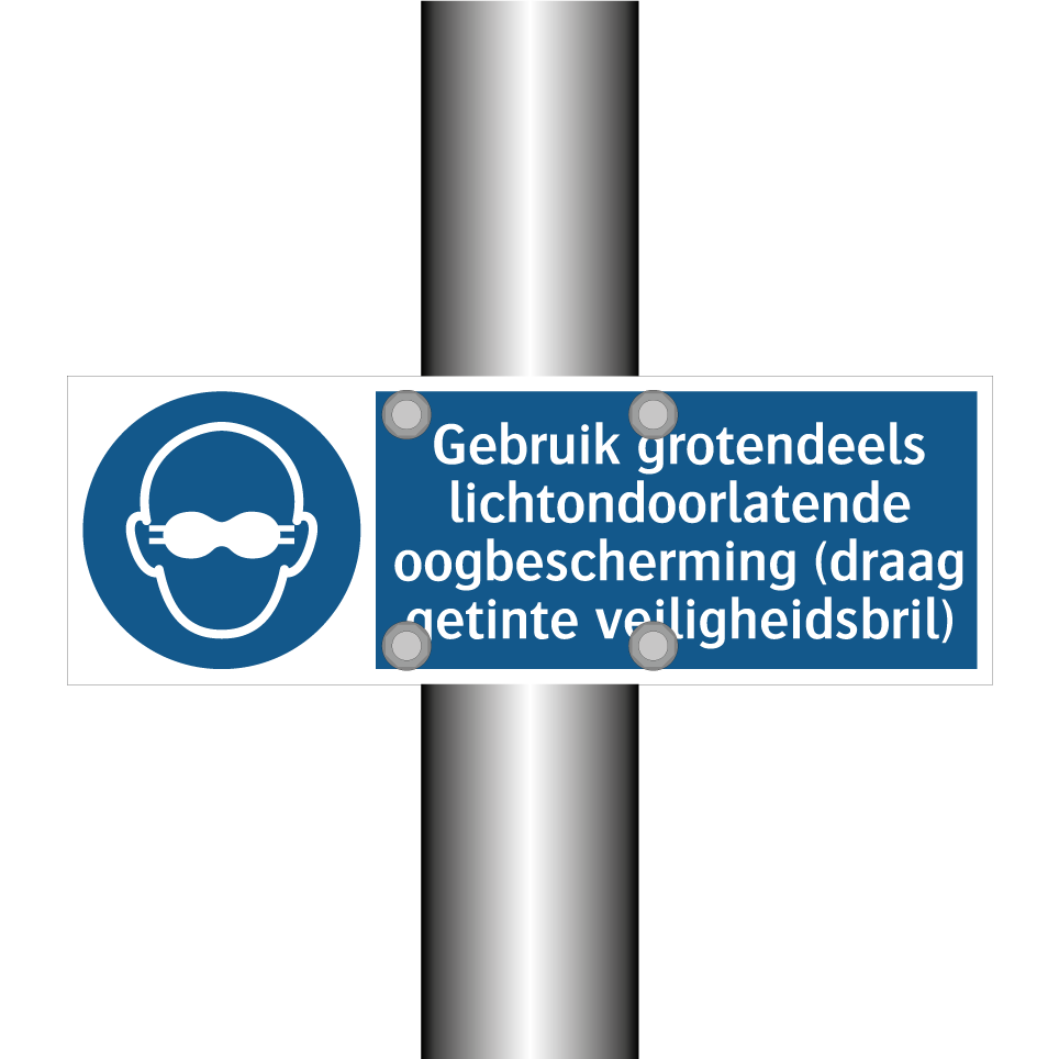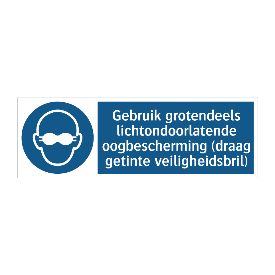 Verplichte bord met de tekst Gebruik grotendeels lichtondoorlatende oogbescherming (draag getinte veiligheidsbril)