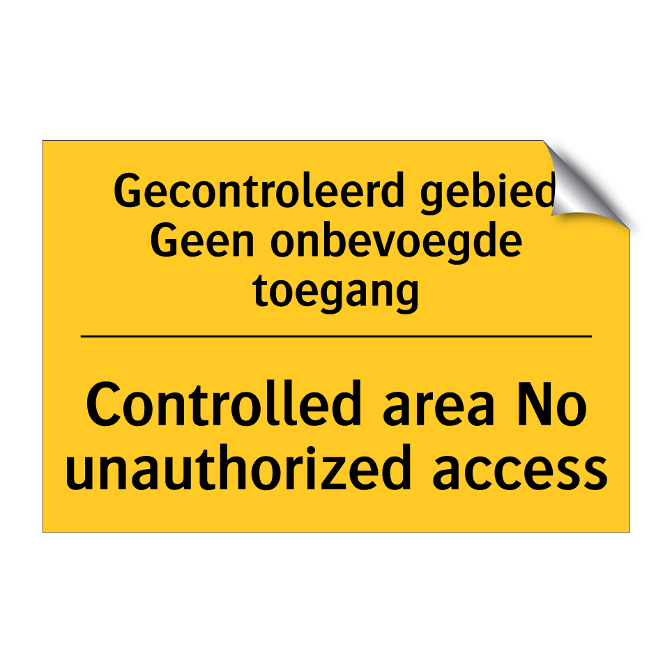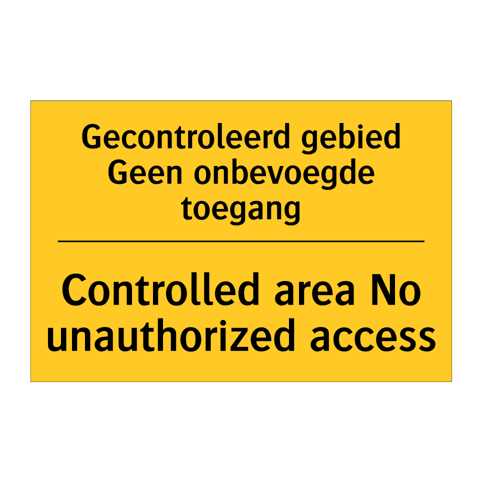 Waarschuwingsbord met de tekst Gecontroleerd gebied Geen onbevoegde toegang / Controlled area No unauthorized access