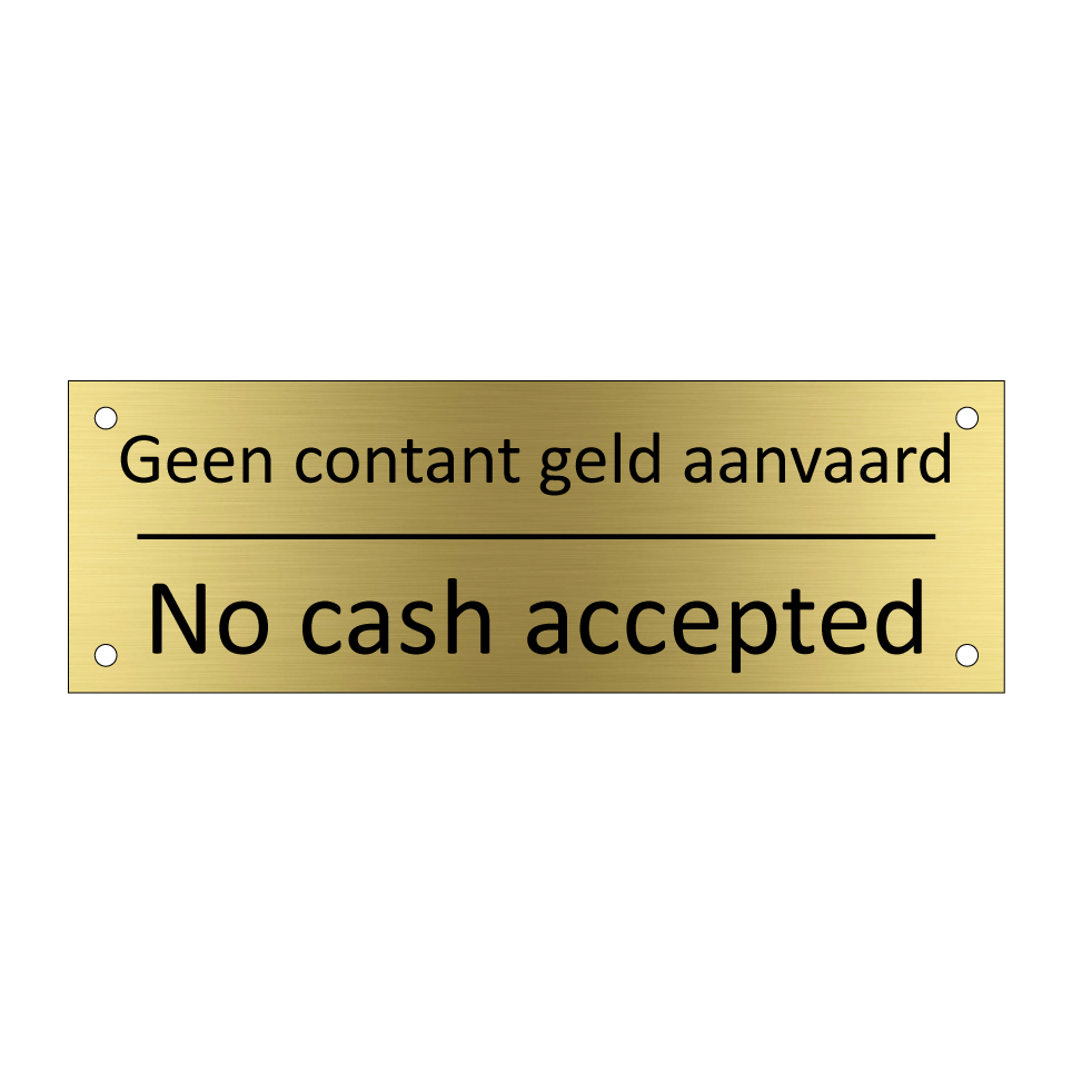 Informatiebord met tekst in het nederlands en engels. Dit bord luidt: Geen contant geld aanvaard evenals met de engelse vertaling No cash accepted.