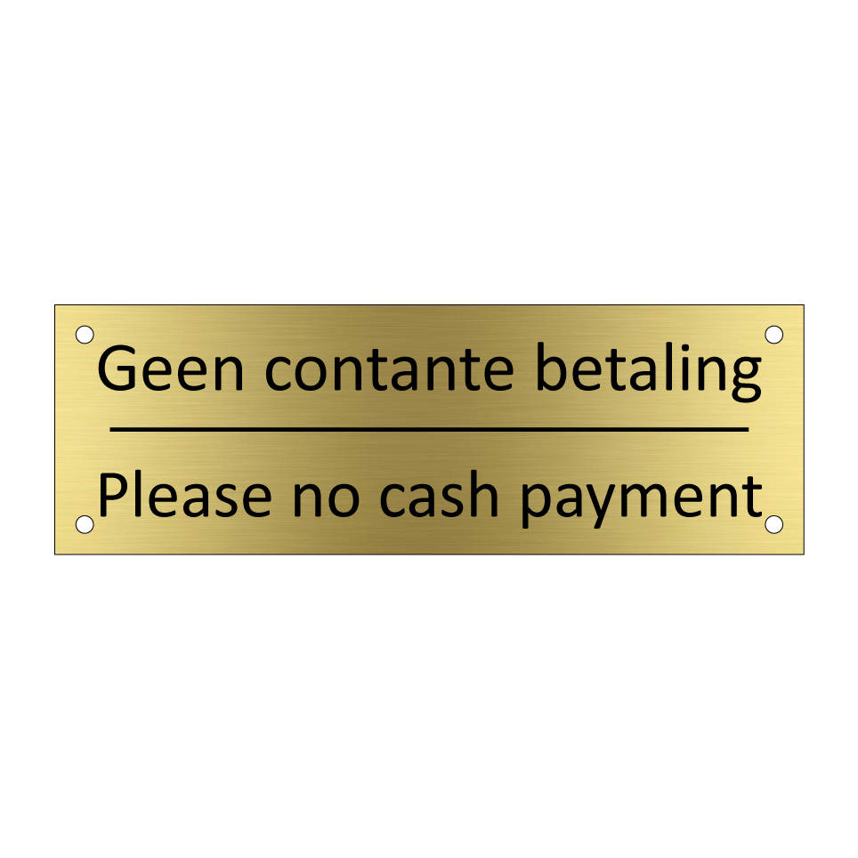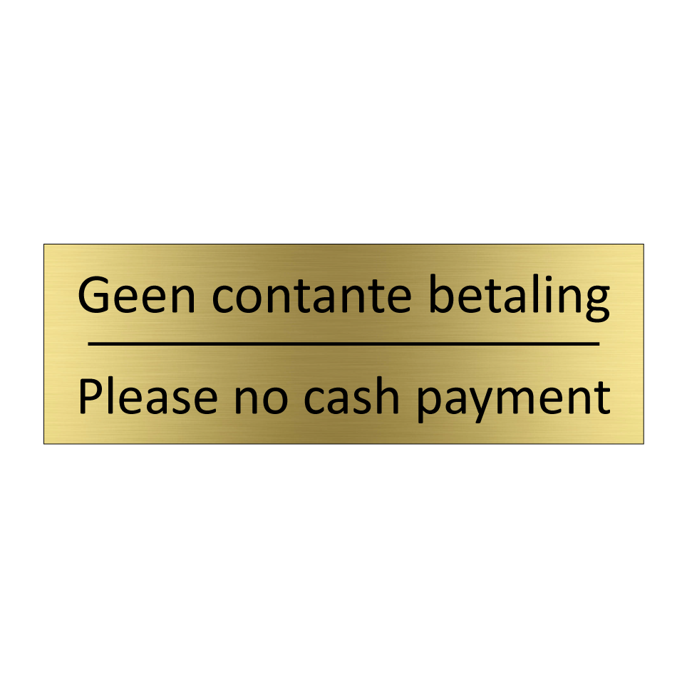 Informatiebord met tekst in het nederlands en engels. Dit bord luidt: Geen contante betaling evenals met de engelse vertaling Please no cash payment.