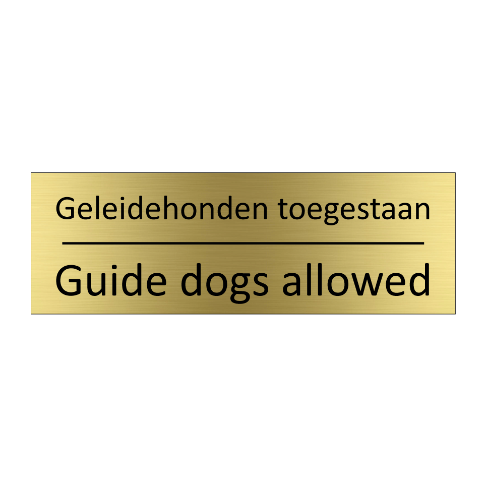 Informatiebord met tekst in het nederlands en engels. Dit bord luidt: Geleidehonden toegestaan evenals met de engelse vertaling Guide dogs allowed.