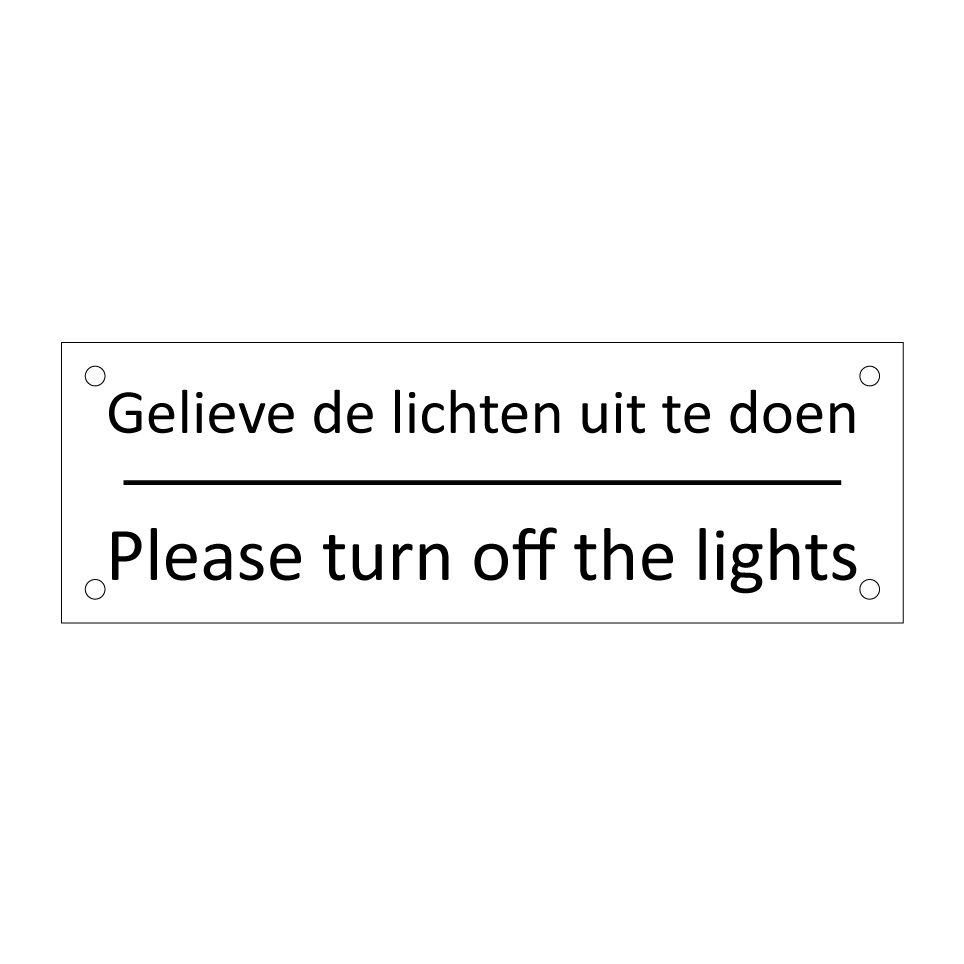 Informatiebord met tekst in het nederlands en engels. Dit bord luidt: Gelieve de lichten uit te doen evenals met de engelse vertaling Please turn off the lights.