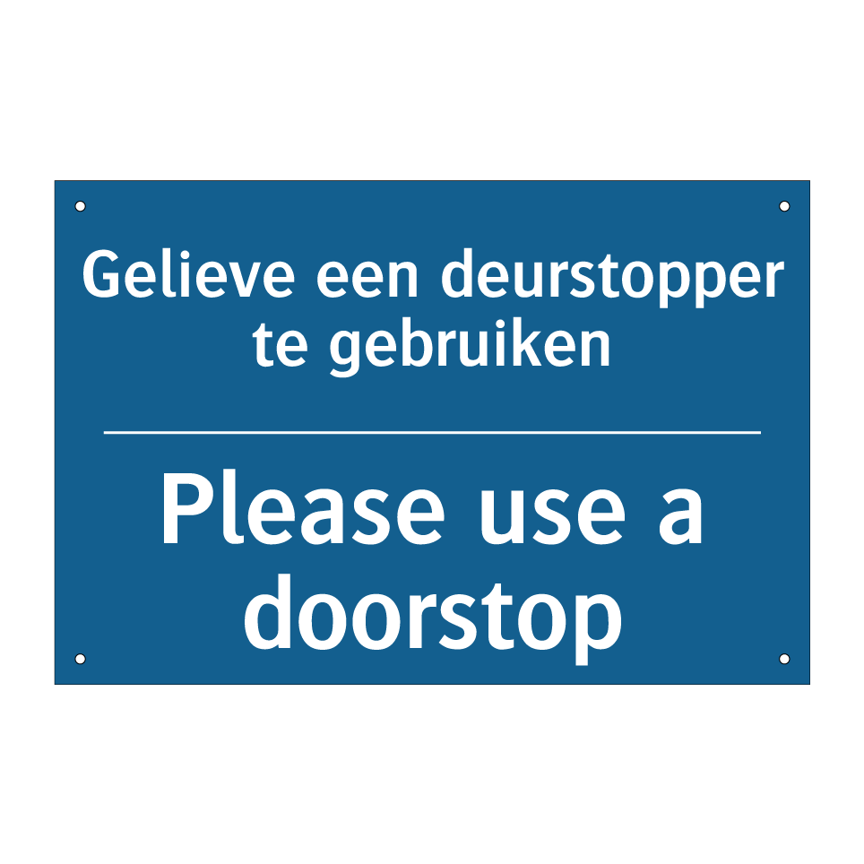 Verplichte bord met de tekst Gelieve een deurstopper te gebruiken - Please use a doorstop