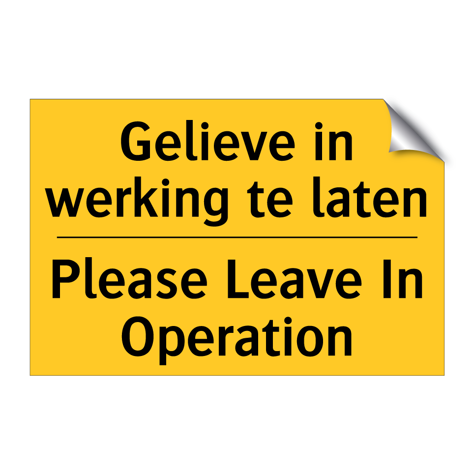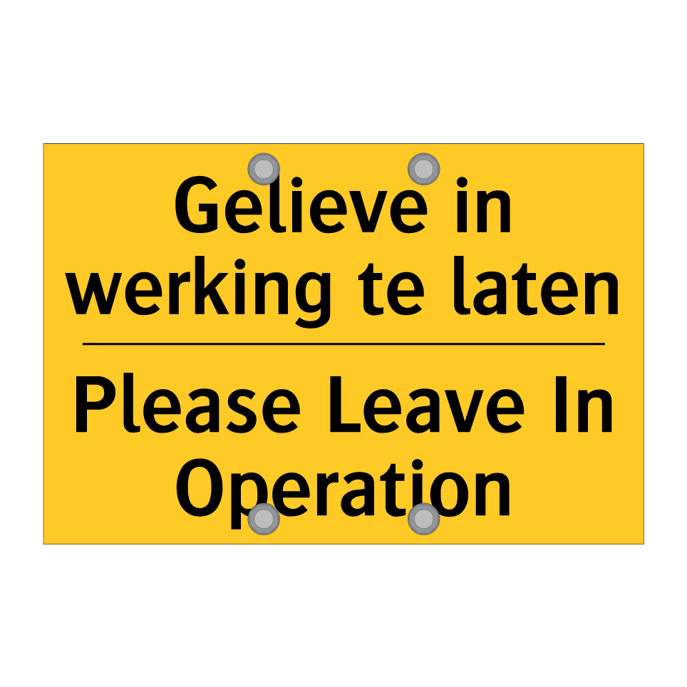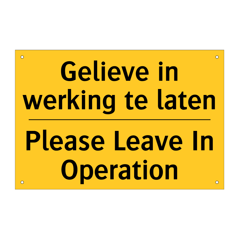 Waarschuwingsbord met de tekst Gelieve in werking te laten / Please Leave In Operation