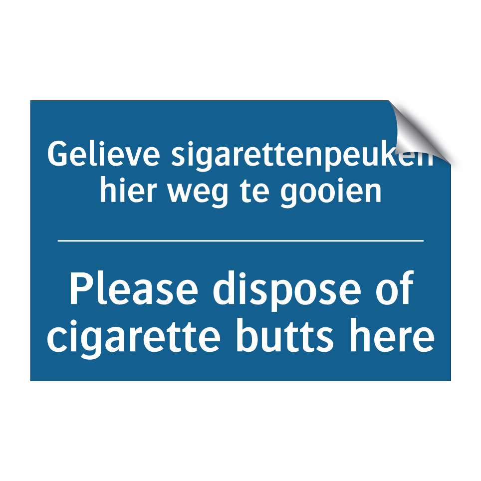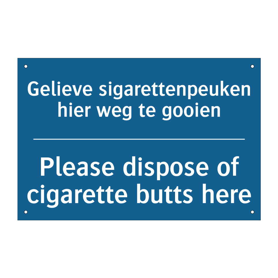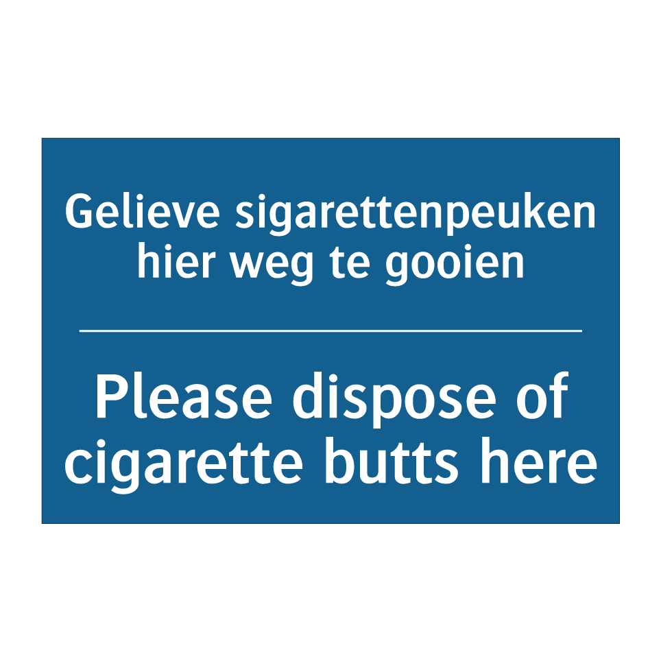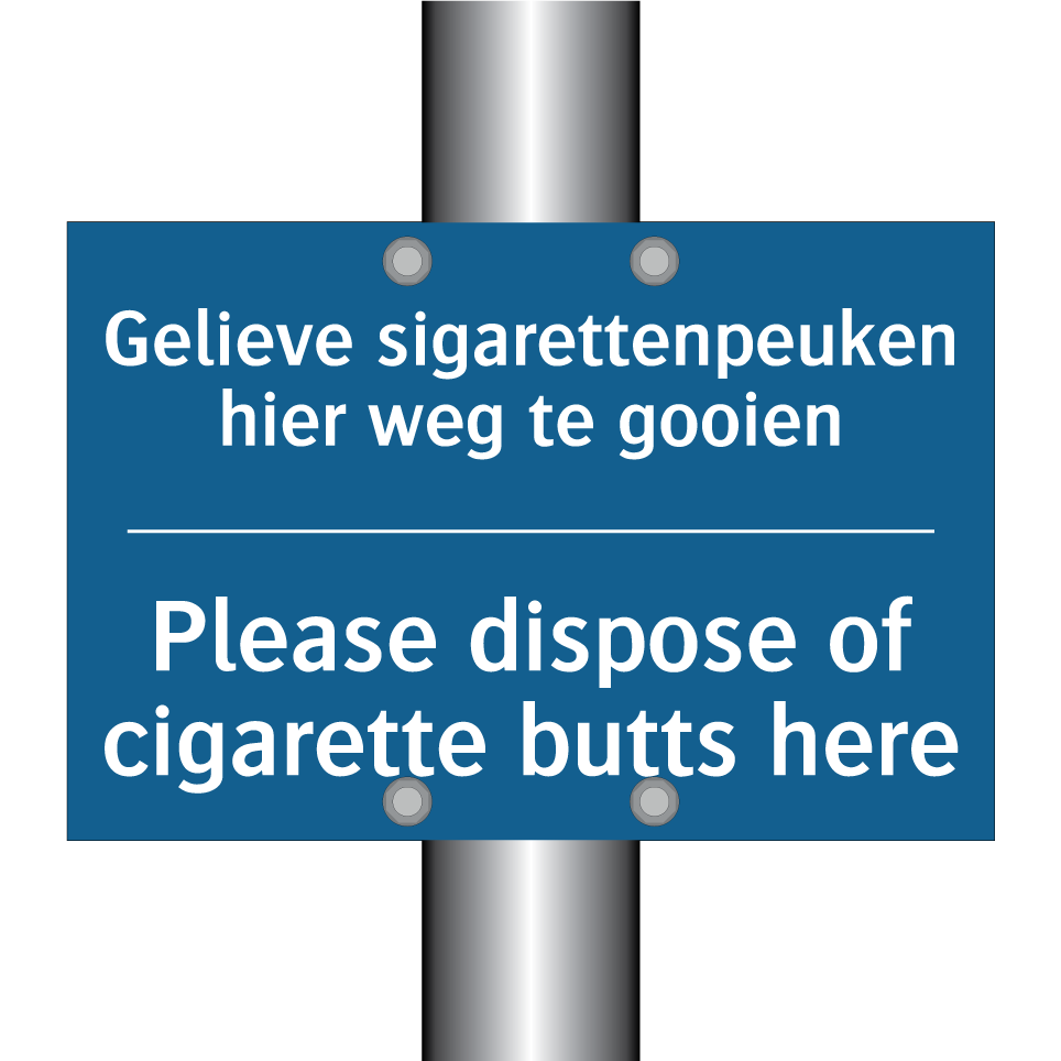 Verplichte bord met de tekst Gelieve sigarettenpeuken hier weg te gooien - Please dispose of cigarette butts here