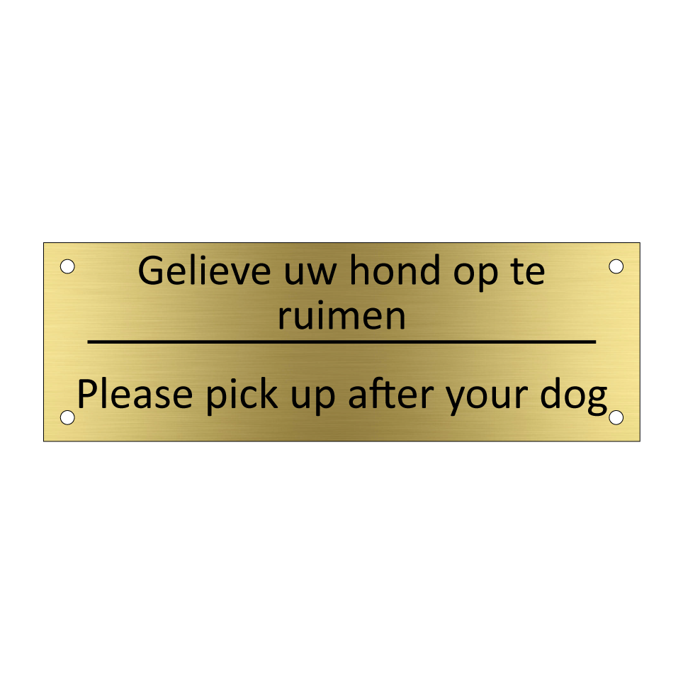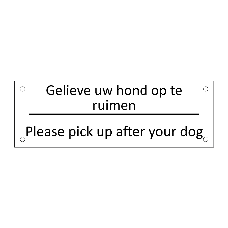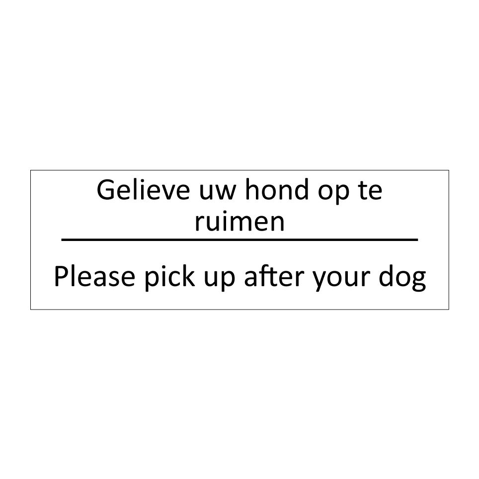 Informatiebord met tekst in het nederlands en engels. Dit bord luidt: Gelieve uw hond op te ruimen evenals met de engelse vertaling Please pick up after your dog.