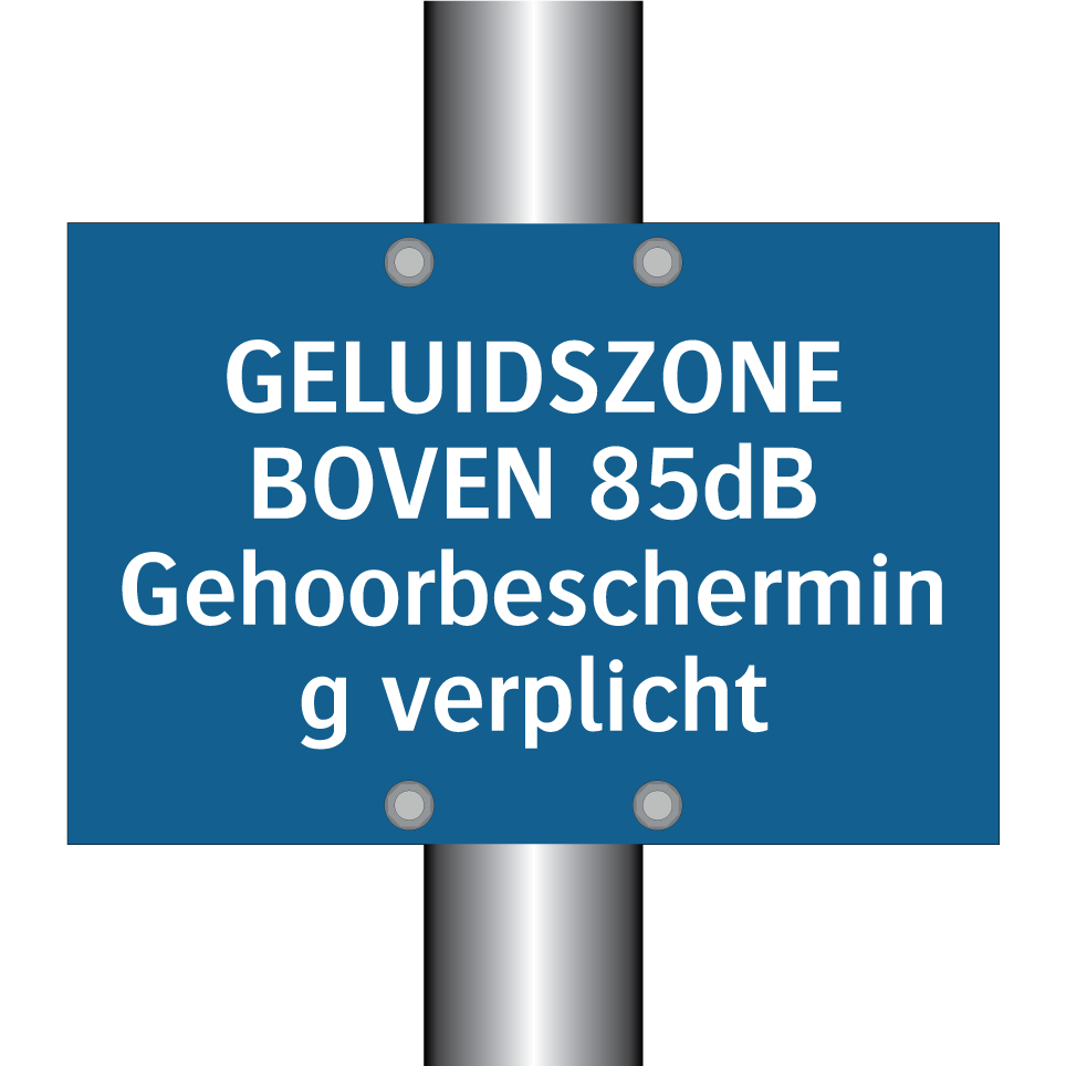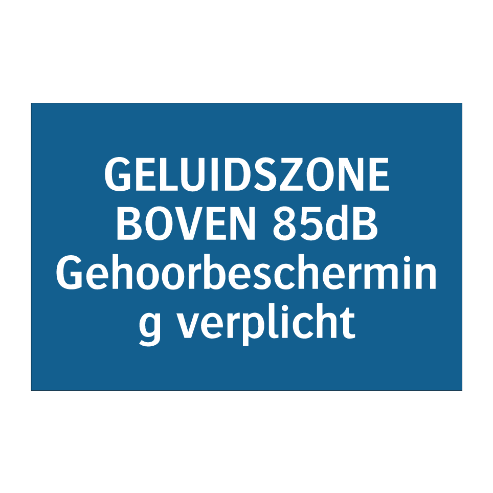 Verplichte bord met de tekst GELUIDSZONE BOVEN 85dB Gehoorbescherming verplicht
