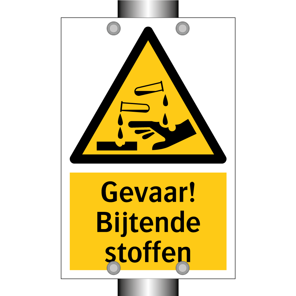 Waarschuwingsbord met de tekst Gevaar! Bijtende stoffen