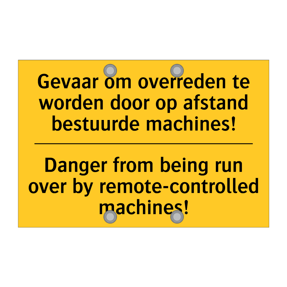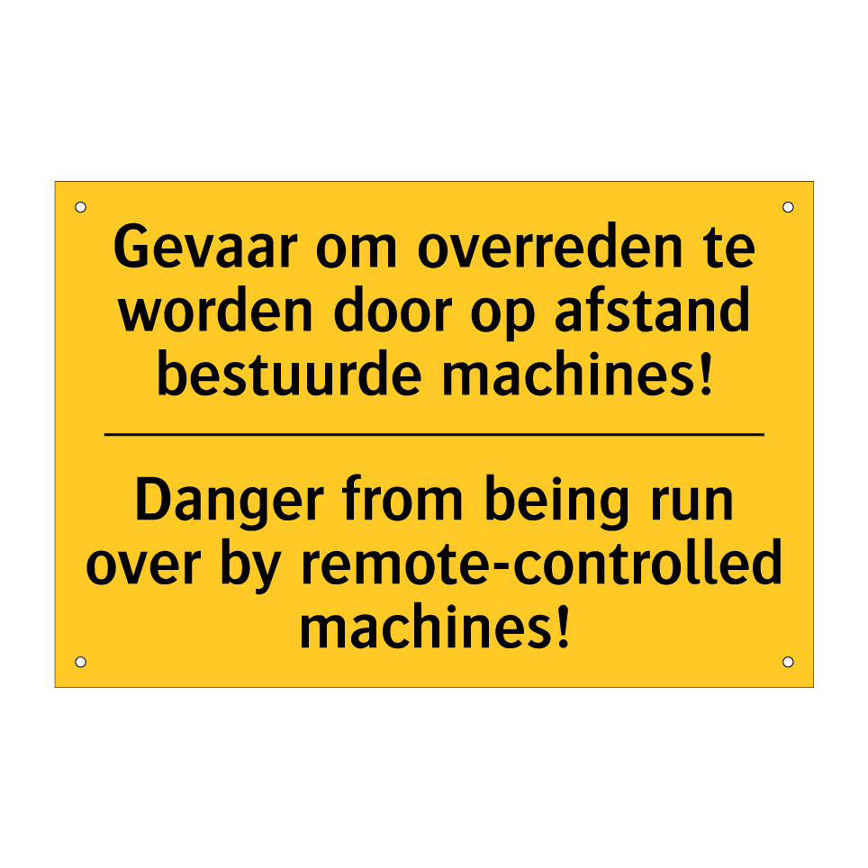 Waarschuwingsbord met de tekst Gevaar om overreden te worden door op afstand bestuurde machines! / Danger from being run over by remote-controlled machines!