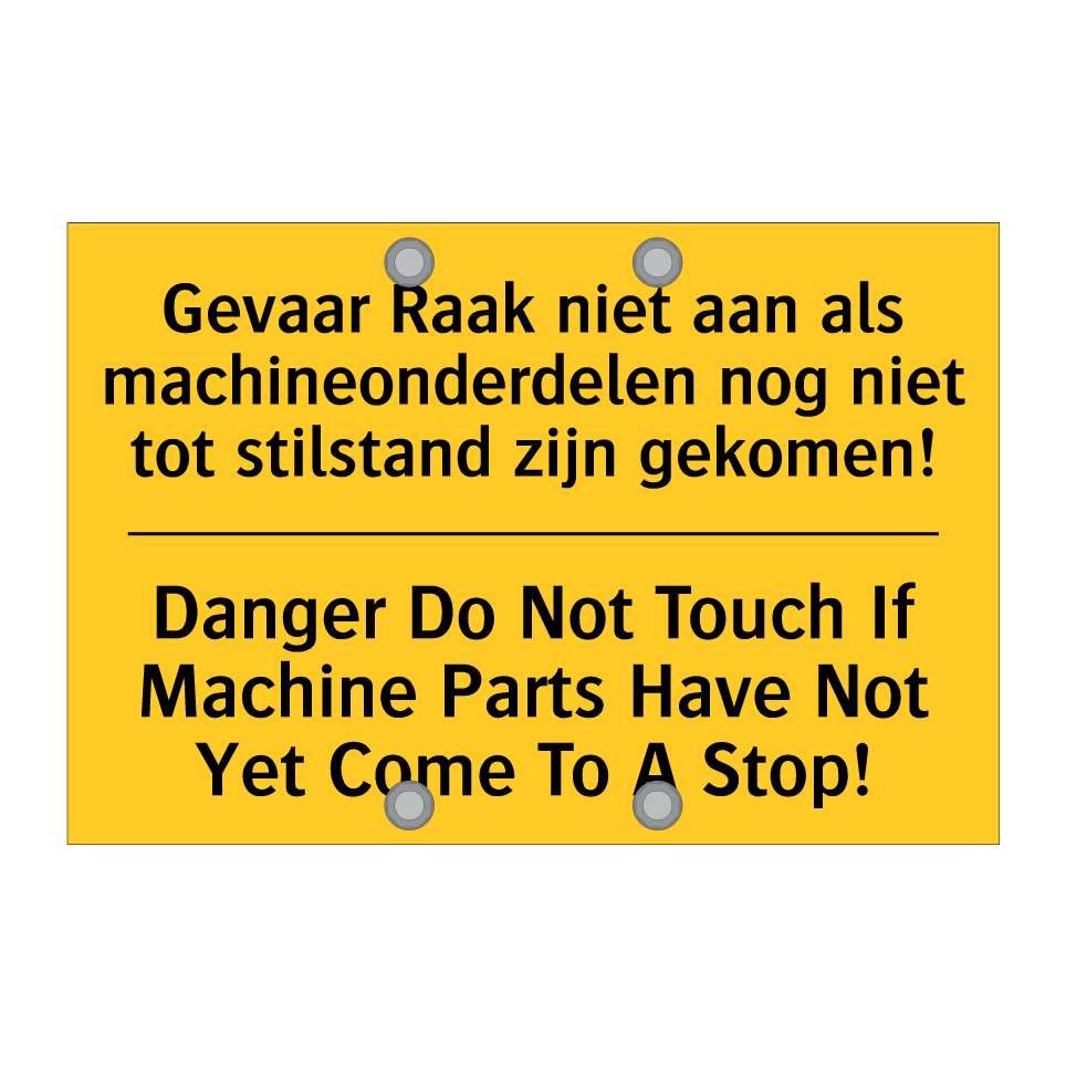 Waarschuwingsbord met de tekst Gevaar Raak niet aan als machineonderdelen nog niet tot stilstand zijn gekomen! / Danger Do Not Touch If Machine Parts Have Not Yet Come To A Stop!