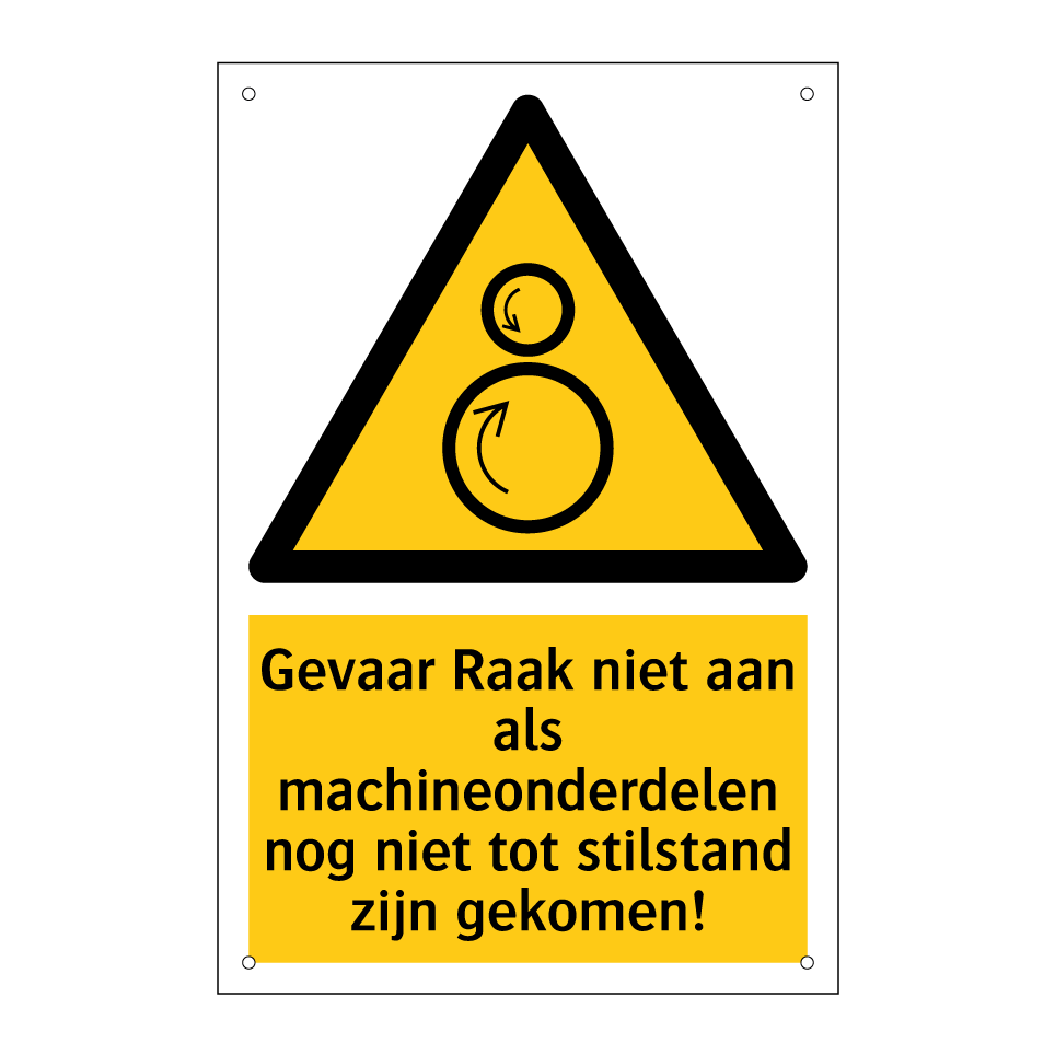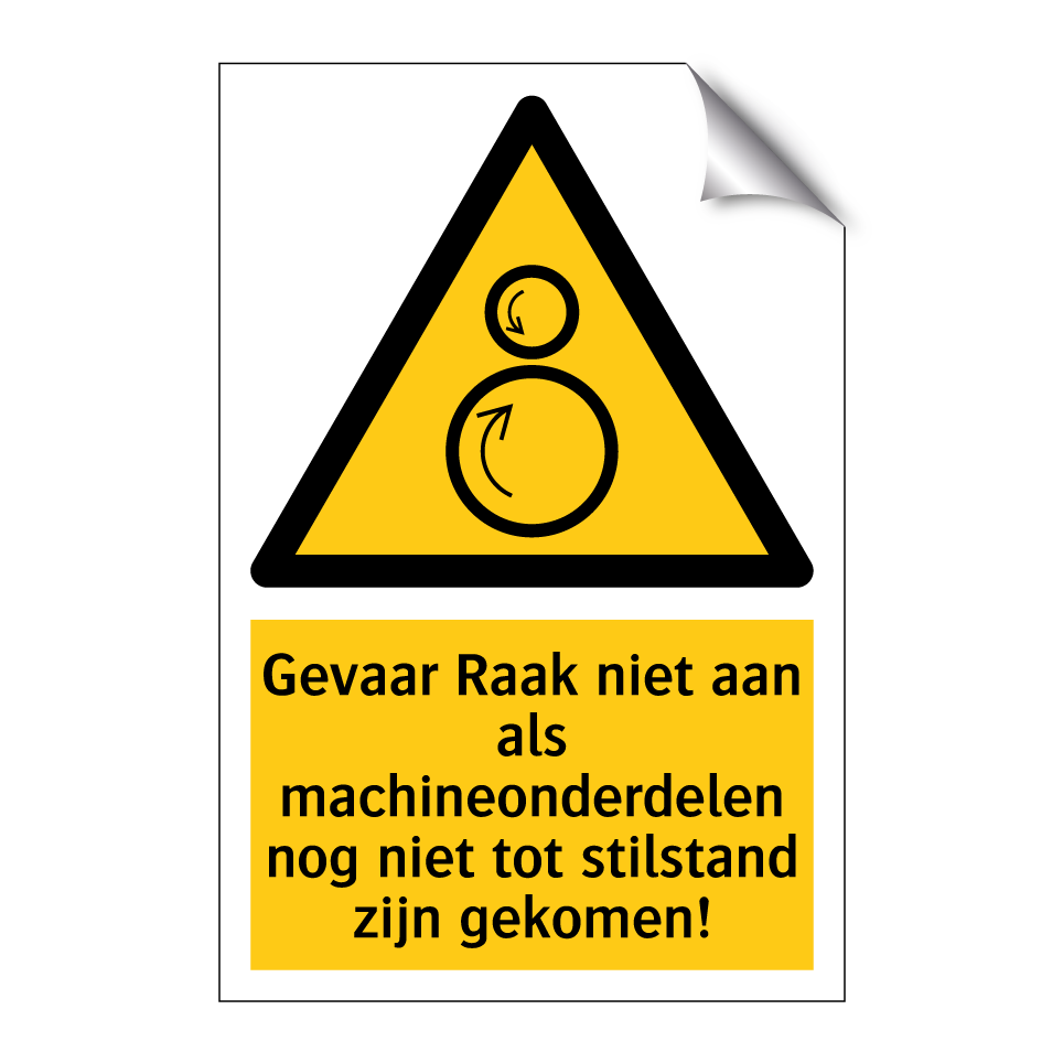 Waarschuwingsbord met de tekst Gevaar Raak niet aan als machineonderdelen nog niet tot stilstand zijn gekomen!