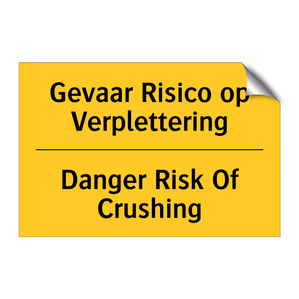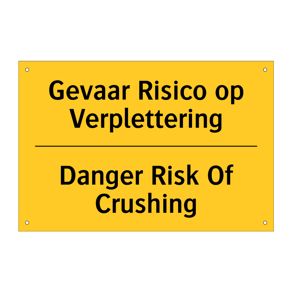 Waarschuwingsbord met de tekst Gevaar Risico op Verplettering / Danger Risk Of Crushing