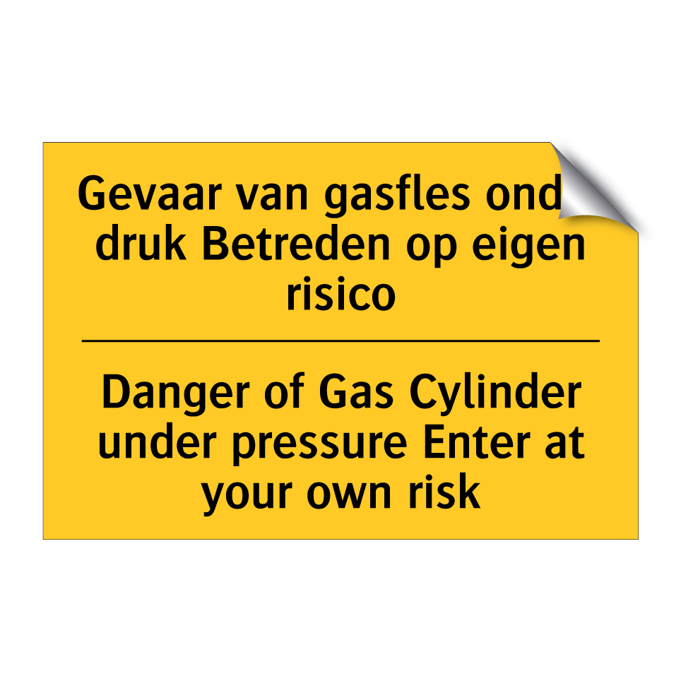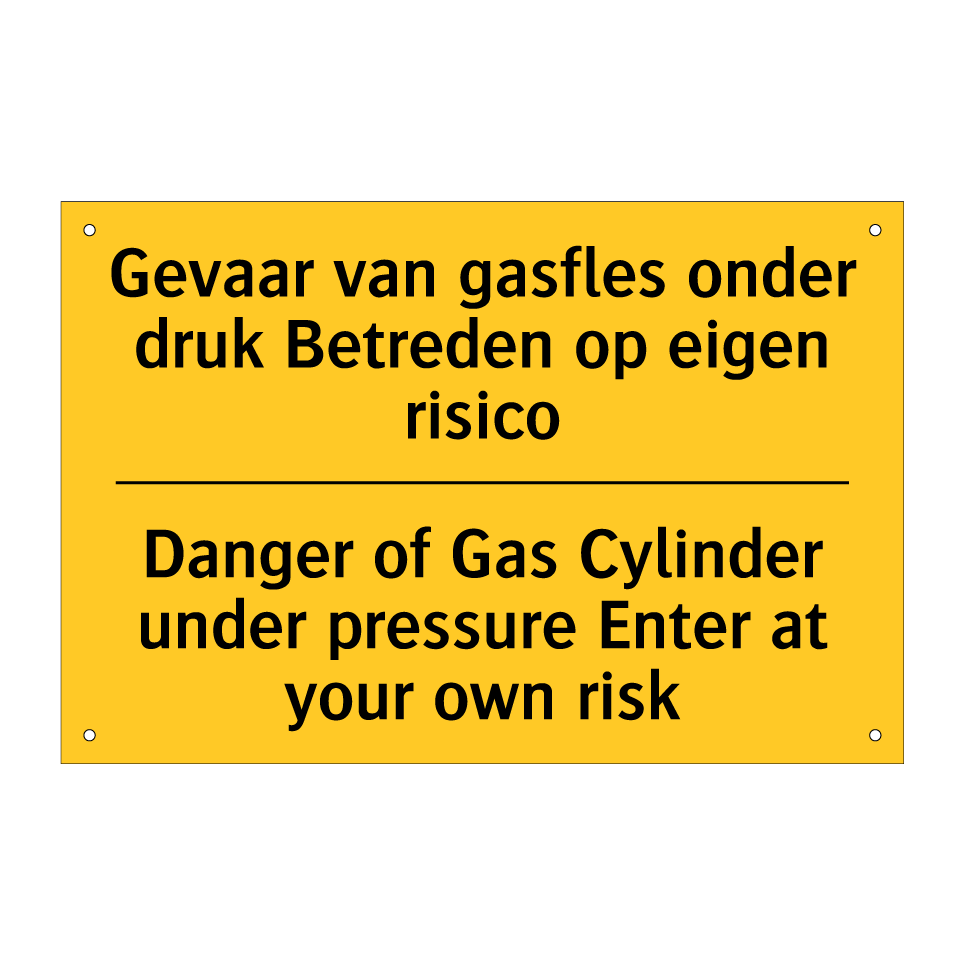 Waarschuwingsbord met de tekst Gevaar van gasfles onder druk Betreden op eigen risico / Danger of Gas Cylinder under pressure Enter at your own risk