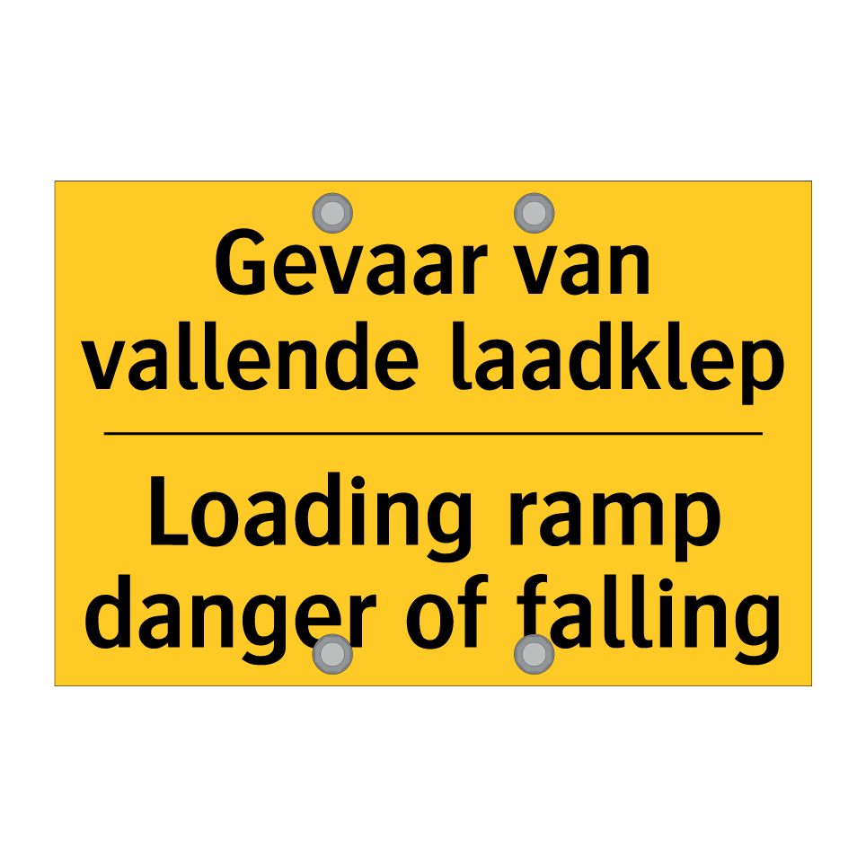 Waarschuwingsbord met de tekst Gevaar van vallende laadklep / Loading ramp danger of falling