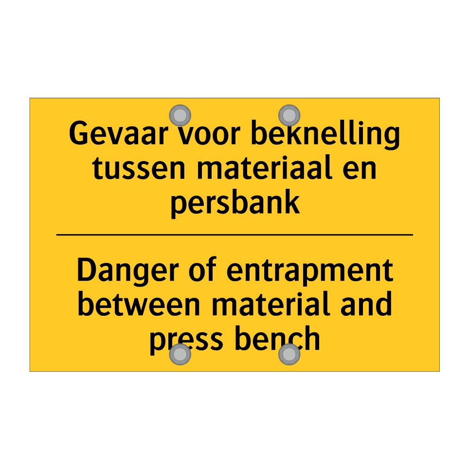 Waarschuwingsbord met de tekst Gevaar voor beknelling tussen materiaal en persbank / Danger of entrapment between material and press bench