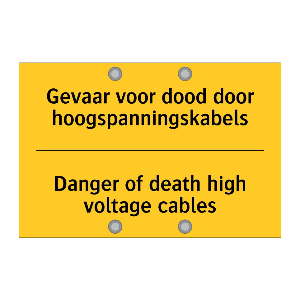 Waarschuwingsbord met de tekst Gevaar voor dood door hoogspanningskabels / Danger of death high voltage cables