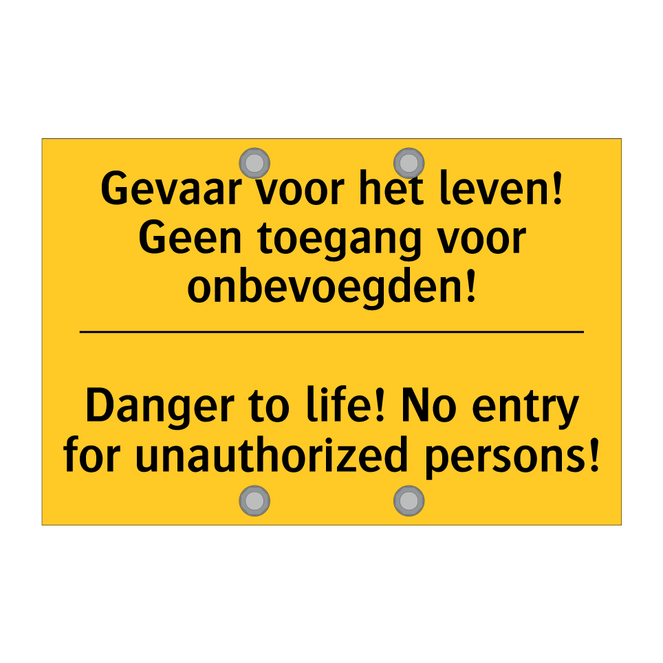 Waarschuwingsbord met de tekst Gevaar voor het leven! Geen toegang voor onbevoegden! / Danger to life! No entry for unauthorized persons!