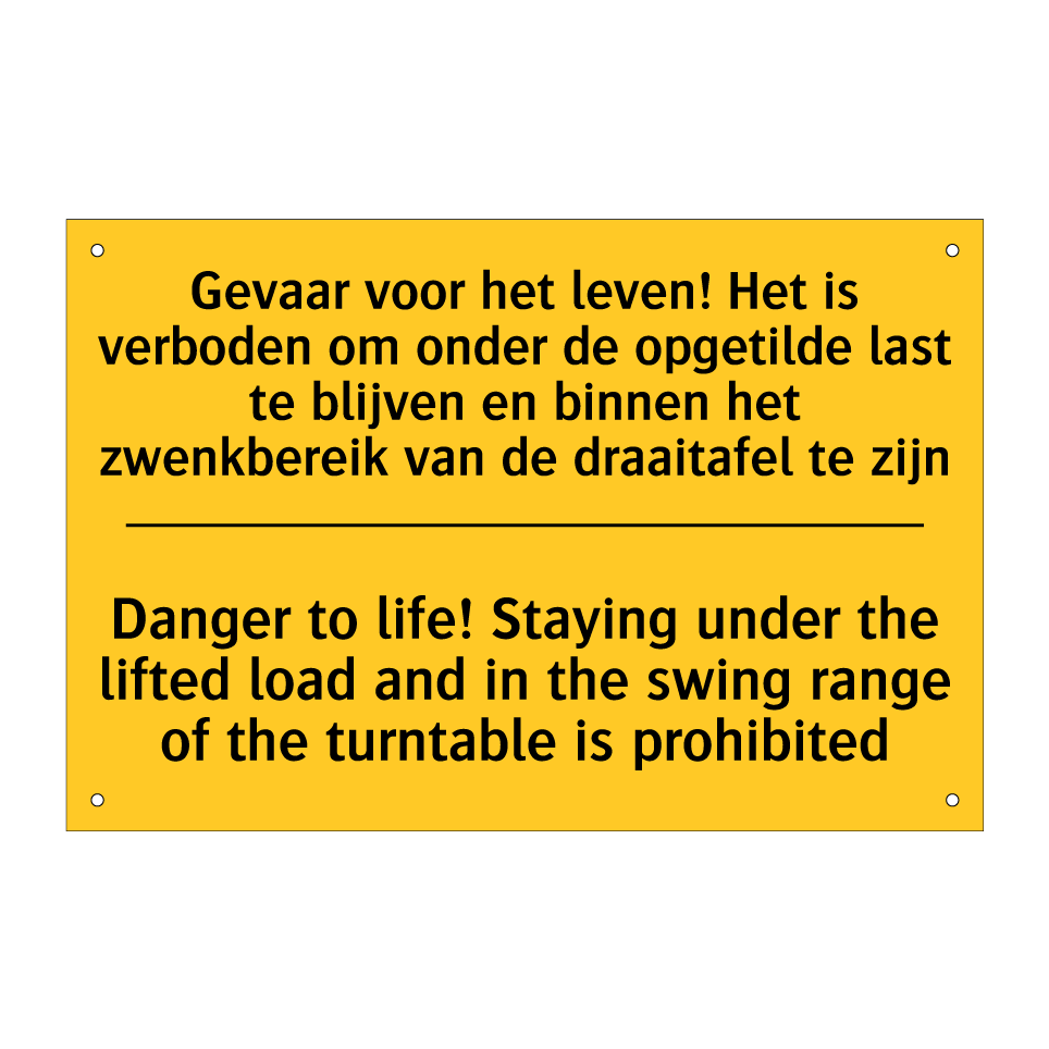 Waarschuwingsbord met de tekst Gevaar voor het leven! Het is verboden om onder de opgetilde last te blijven en binnen het zwenkbereik van de draaitafel te zijn / Danger to life! Staying under the lifted load and in the swing range of the turntable is prohibited