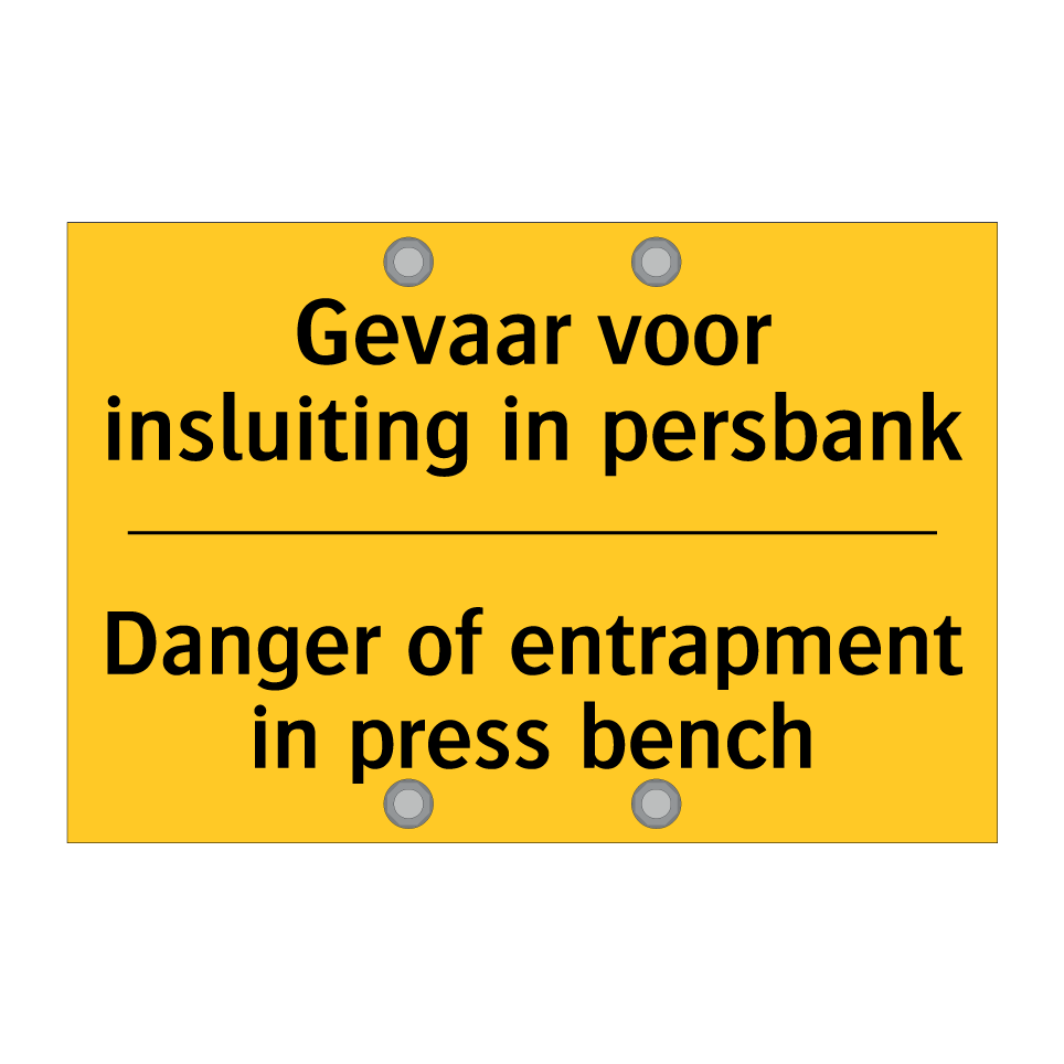 Waarschuwingsbord met de tekst Gevaar voor insluiting in persbank / Danger of entrapment in press bench