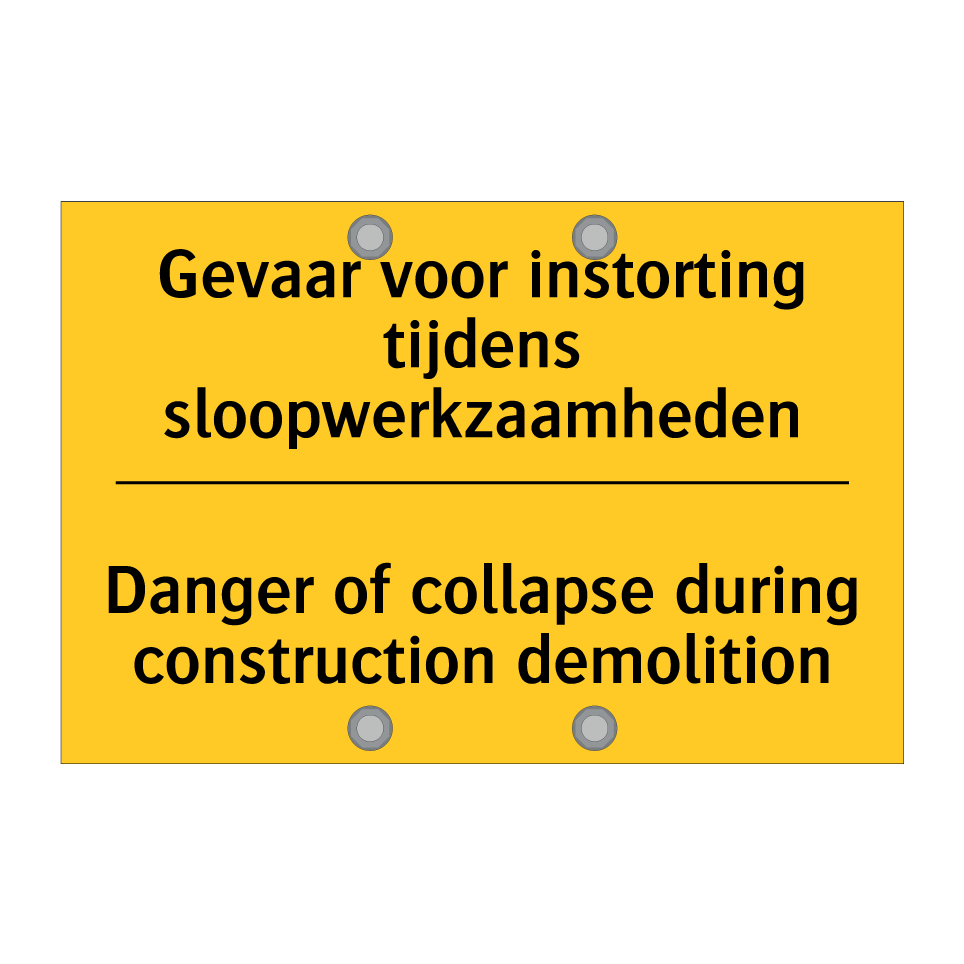 Waarschuwingsbord met de tekst Gevaar voor instorting tijdens sloopwerkzaamheden / Danger of collapse during construction demolition