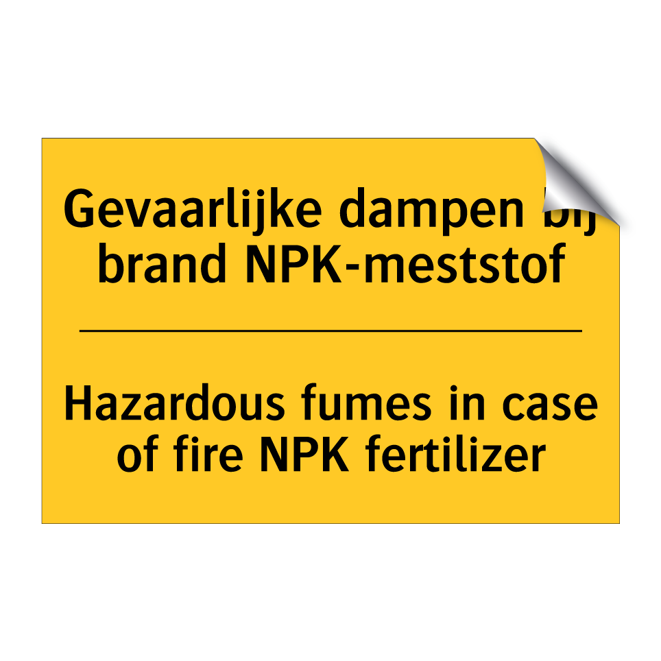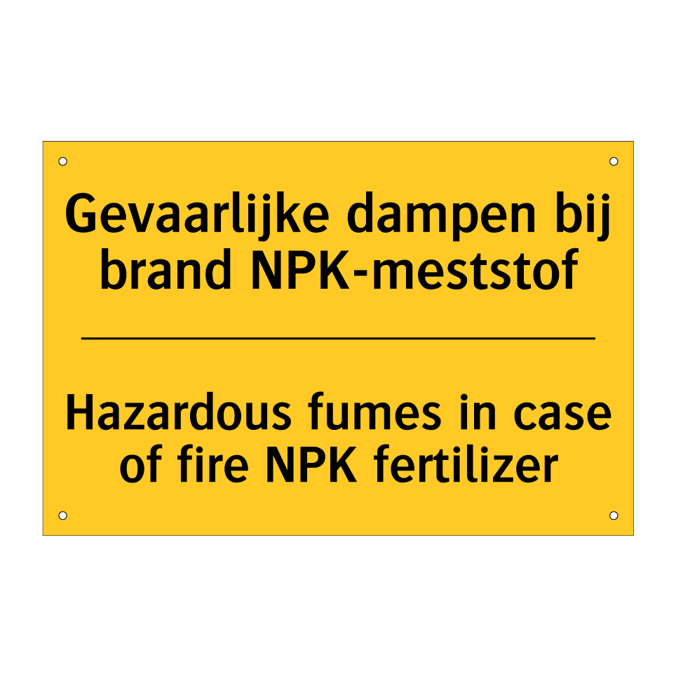 Waarschuwingsbord met de tekst Gevaarlijke dampen bij brand NPK-meststof / Hazardous fumes in case of fire NPK fertilizer