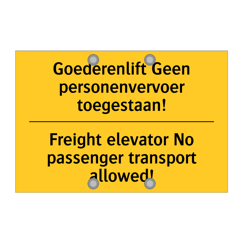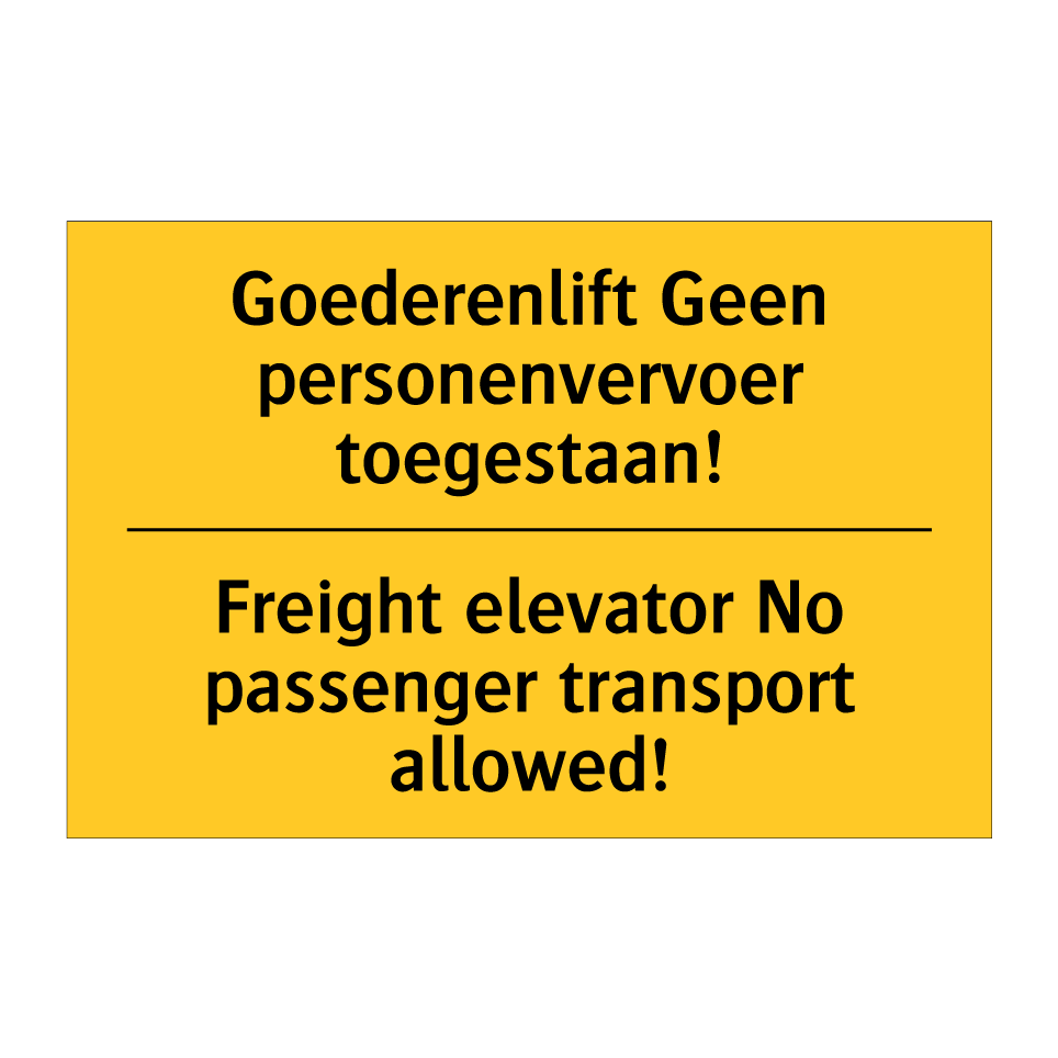 Waarschuwingsbord met de tekst Goederenlift Geen personenvervoer toegestaan! / Freight elevator No passenger transport allowed!