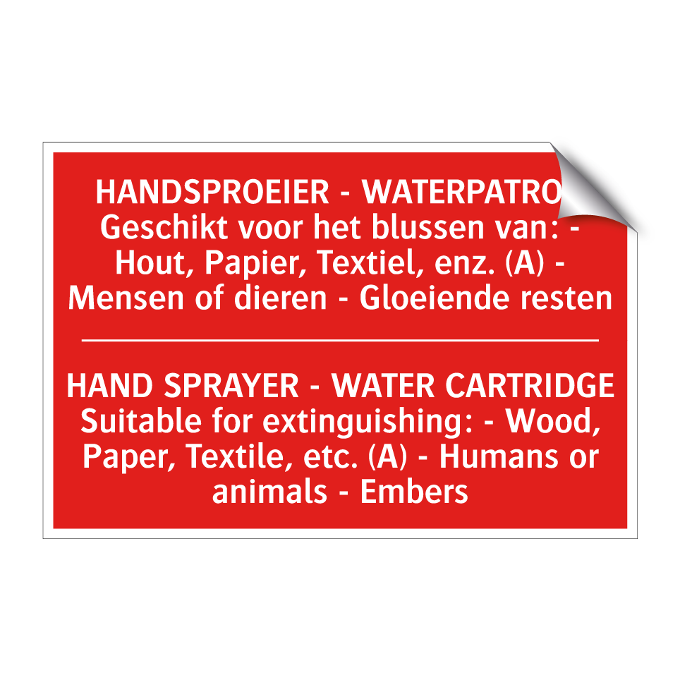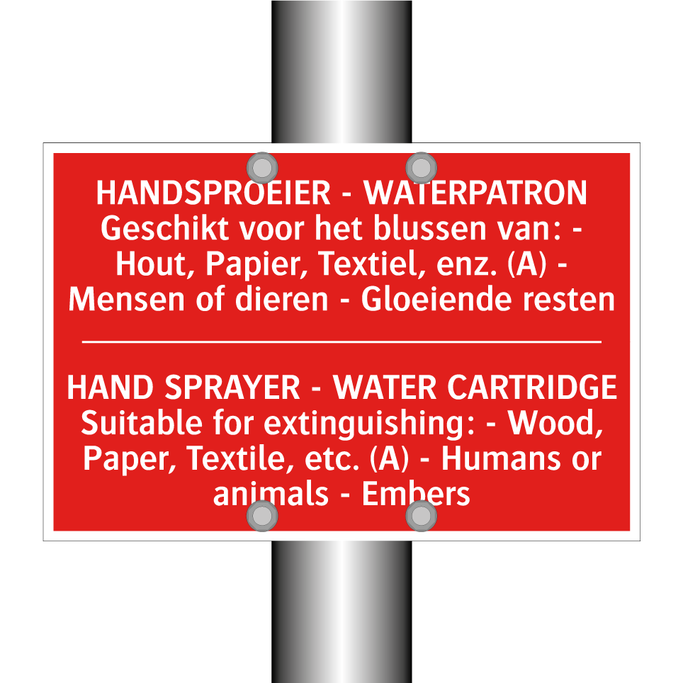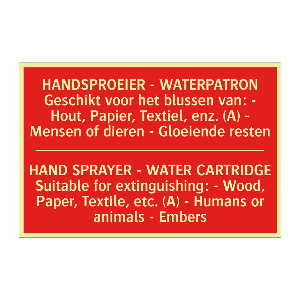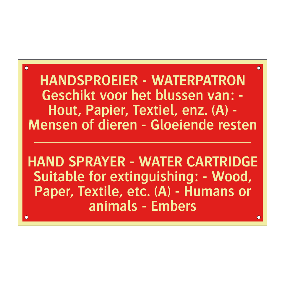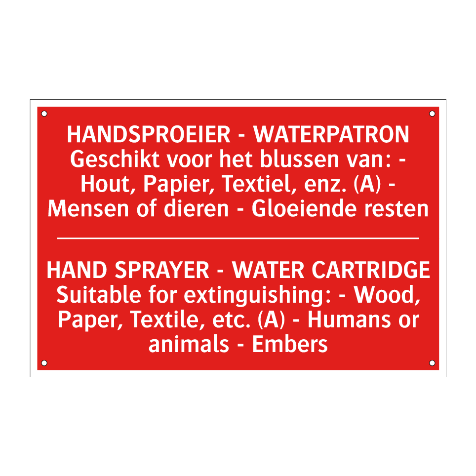 Brandbord met tekst HANDSPROEIER - WATERPATRON Geschikt voor het blussen van: - Hout, Papier, Textiel, enz. (A) - Mensen of dieren - Gloeiende resten / HAND SPRAYER - WATER CARTRIDGE Suitable for extinguishing: - Wood, Paper, Textile, etc. (A) - Humans or animals - Embers