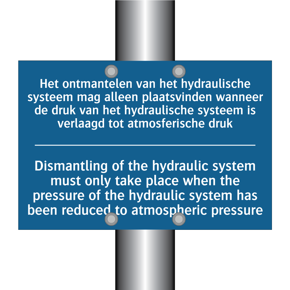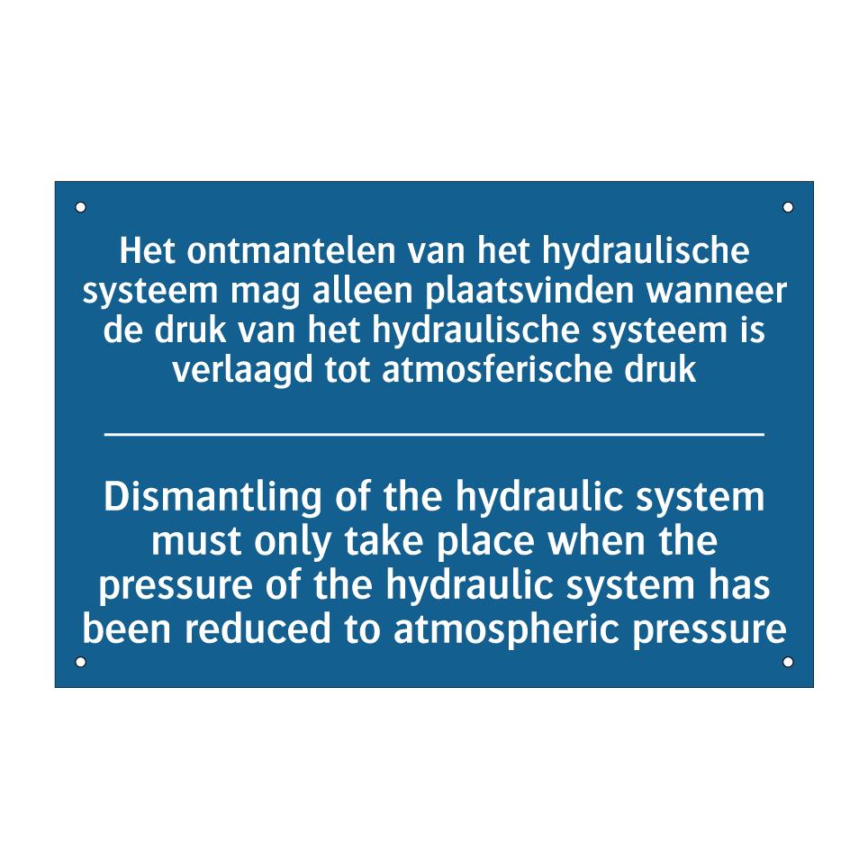 Verplichte bord met de tekst Het ontmantelen van het hydraulische systeem mag alleen plaatsvinden wanneer de druk van het hydraulische systeem is verlaagd tot atmosferische druk - Dismantling of the hydraulic system must only take place when the pressure of the hydraulic system has been reduced to atmospheric pressure