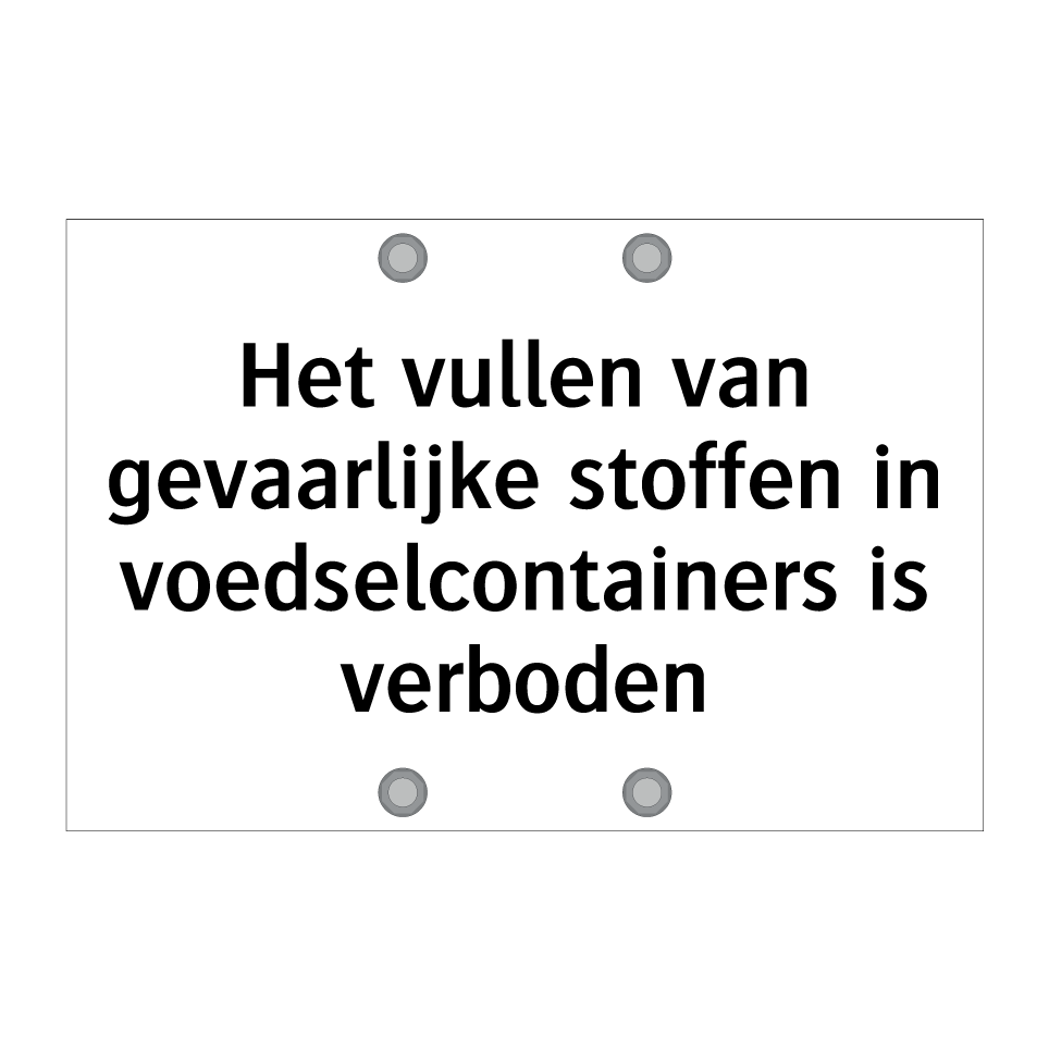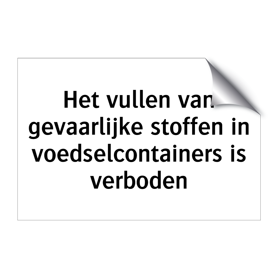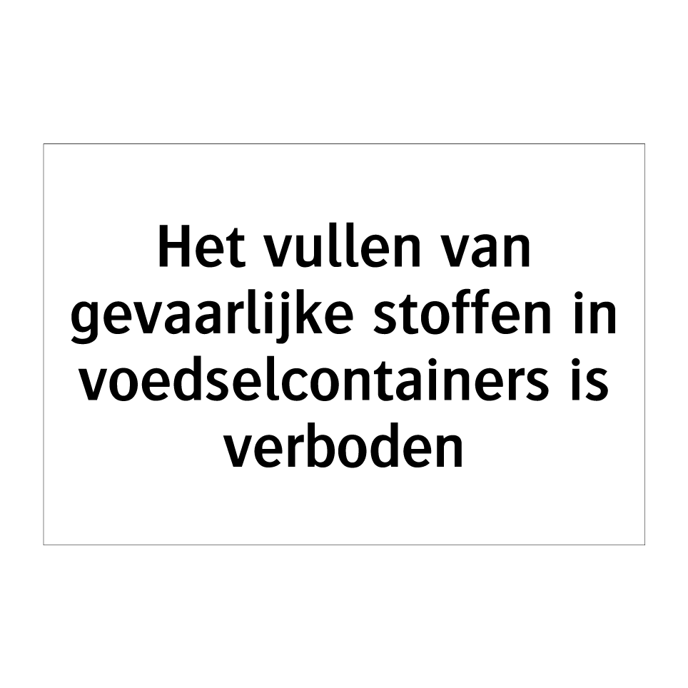 Verbodsbord met de tekst Het vullen van gevaarlijke stoffen in voedselcontainers is verboden
