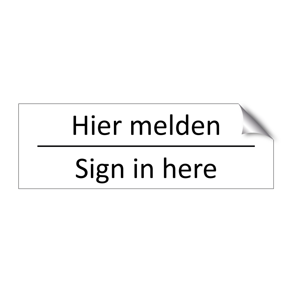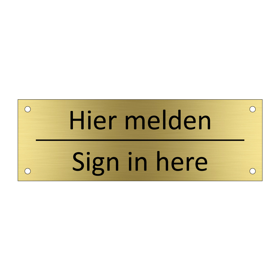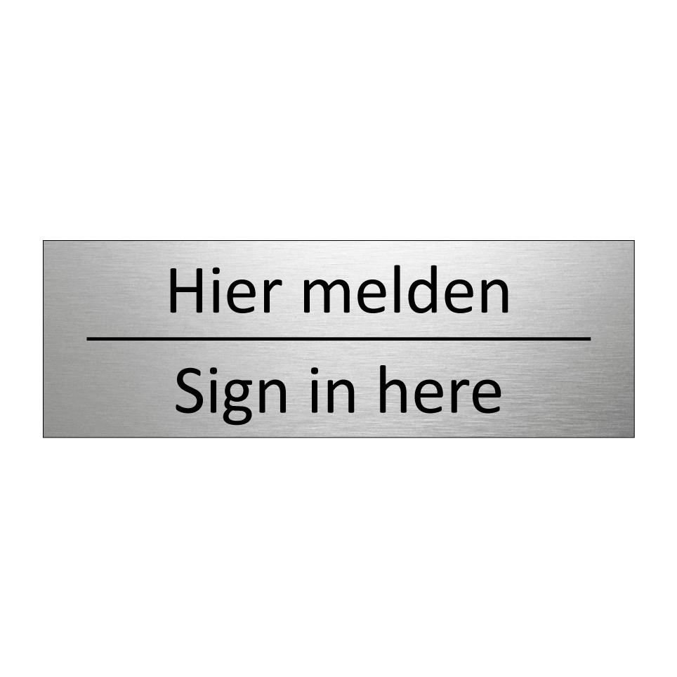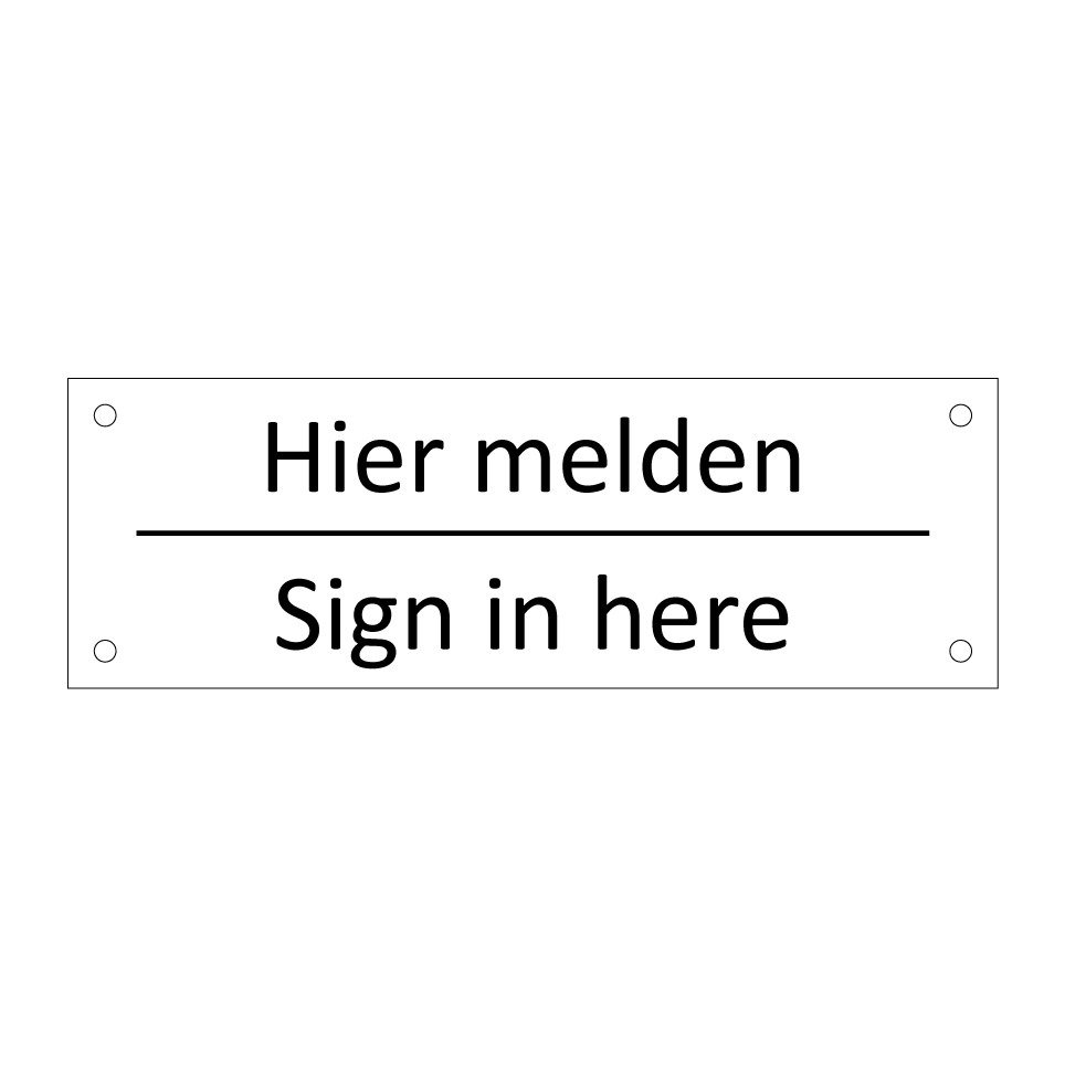 Informatiebord met tekst in het nederlands en engels. Dit bord luidt: Hier melden evenals met de engelse vertaling Sign in here.