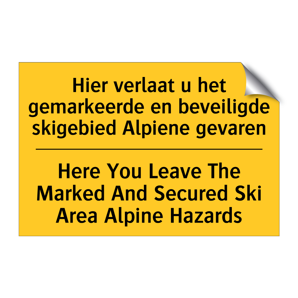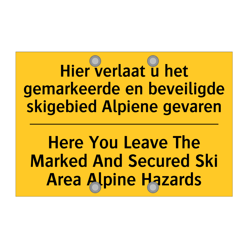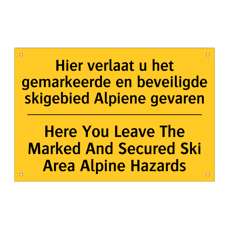 Dit waarschuwingsbord met gele achtergrond en zwarte tekst is essentieel voor de veiligheid in skigebieden. De tweetalige tekst, zowel in het Nederlands als in het Engels, zorgt ervoor dat een breed publiek de boodschap begrijpt. Dit bordje is ideaal voor plaatsing aan de rand van gemarkeerde en beveiligde skigebieden om skiërs te waarschuwen voor alpiene gevaren buiten de afgebakende pistes. Het waarschuwingsbord kan strategisch worden geplaatst bij liften, paden en andere overgangen naar onbeveiligde gebieden. Door de duidelijke en opvallende kleurencombinatie trekt het direct de aandacht van skiërs, waardoor ongelukken en gevaarlijke situaties kunnen worden voorkomen.