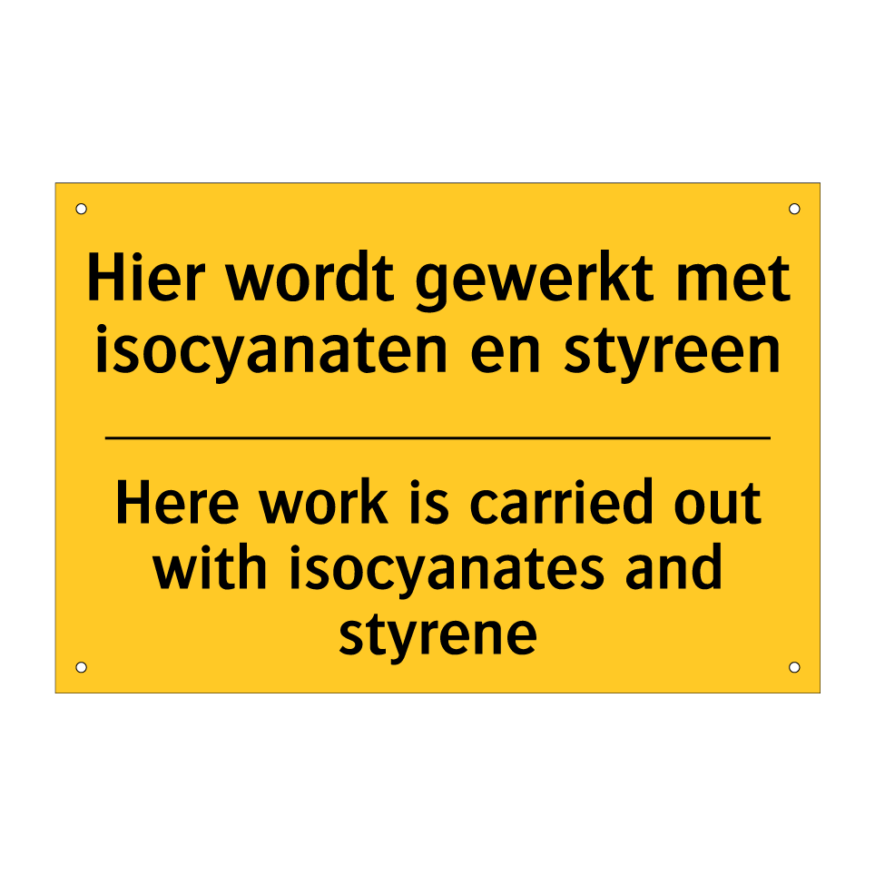 Waarschuwingsbord met de tekst Hier wordt gewerkt met isocyanaten en styreen / Here work is carried out with isocyanates and styrene