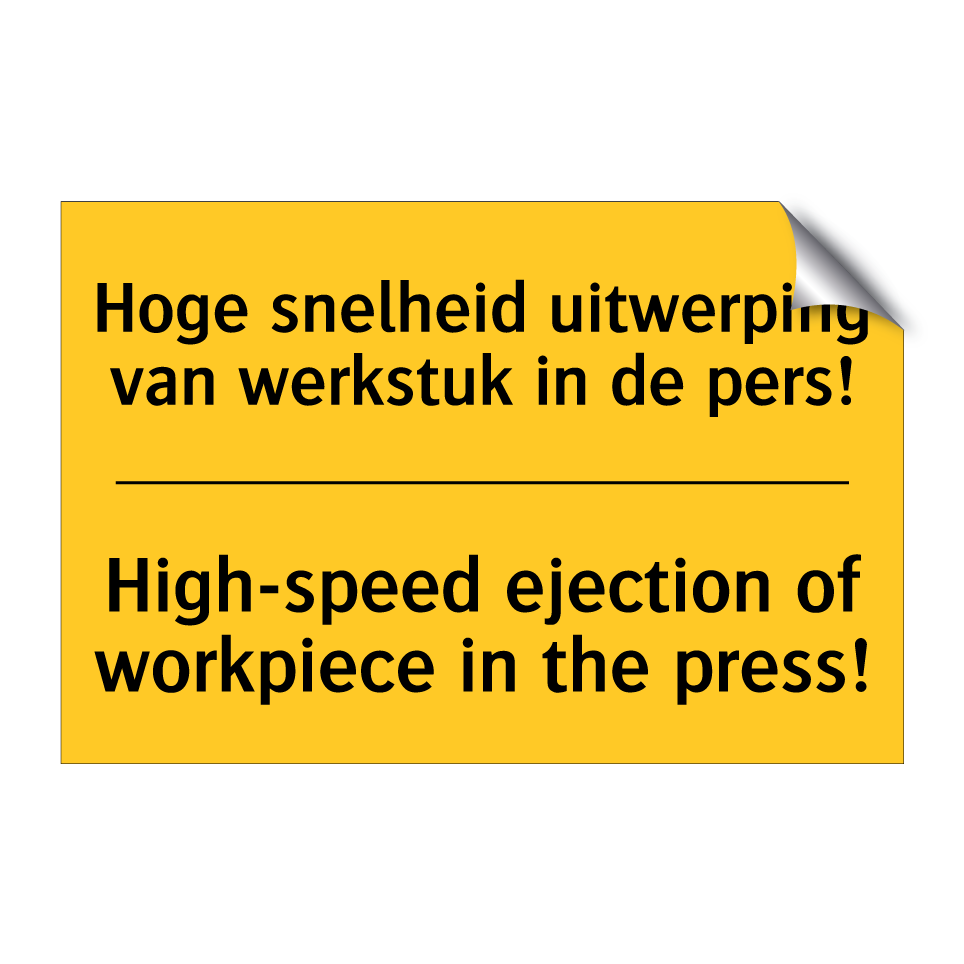 Waarschuwingsbord met de tekst Hoge snelheid uitwerping van werkstuk in de pers! / High-speed ejection of workpiece in the press!