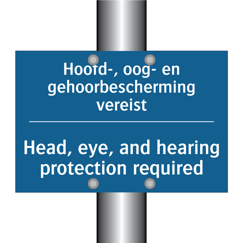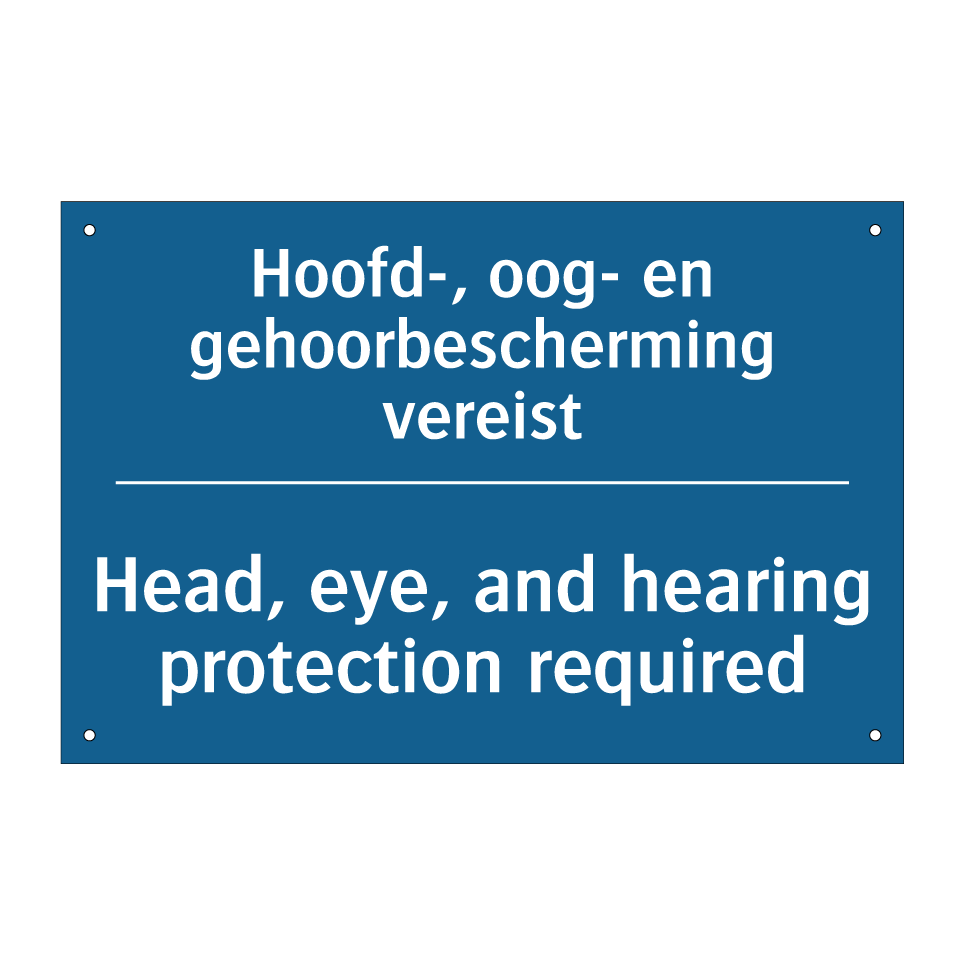 Verplichte bord met de tekst Hoofd-, oog- en gehoorbescherming vereist - Head, eye, and hearing protection required