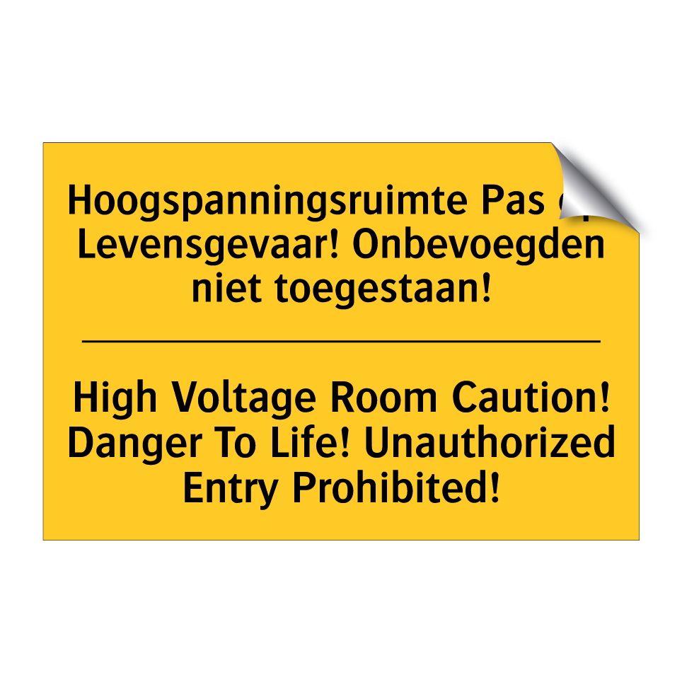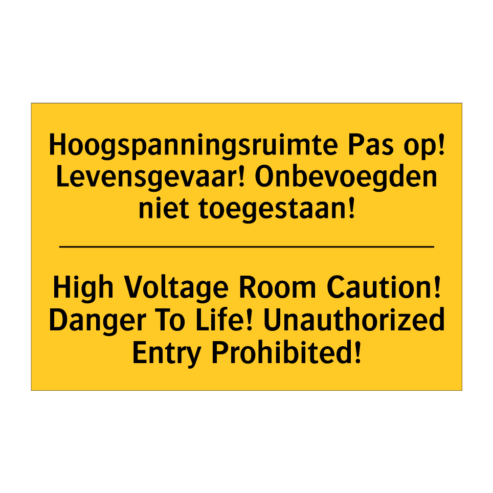 Dit waarschuwingsbord is essentieel voor het markeren van hoogspanningsruimtes en het waarborgen van de veiligheid. Met een opvallende gele achtergrond en zwarte tekst, trekt Dit bordje onmiddellijk de aandacht en waarschuwt het voor levensgevaar. De tweetalige tekst, in zowel Nederlands als Engels, zorgt ervoor dat de boodschap duidelijk is voor een breder publiek, wat vooral handig is in internationale omgevingen. Plaats Dit bordje bij ingangen van hoogspanningsruimtes, technische ruimtes of andere gevaarlijke zones waar onbevoegden geen toegang mogen hebben. Dit waarschuwingsbord helpt ongelukken te voorkomen en verhoogt de algehele veiligheid op de werkplek.