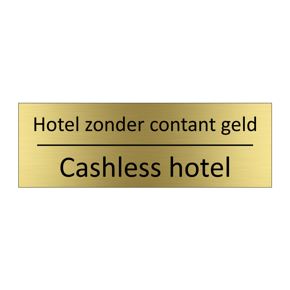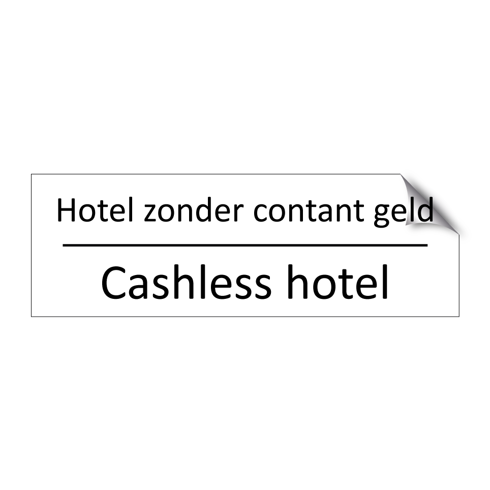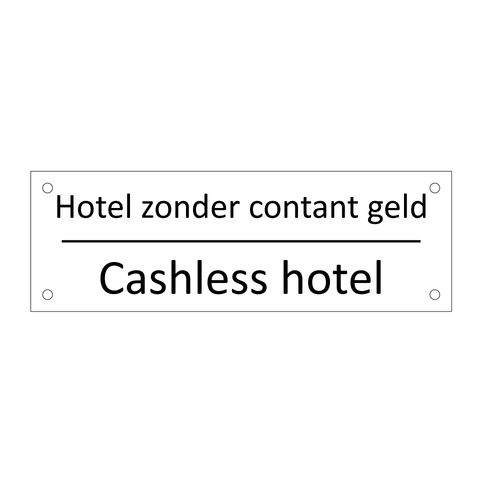 Informatiebord met tekst in het nederlands en engels. Dit bord luidt: Hotel zonder contant geld evenals met de engelse vertaling Cashless hotel.