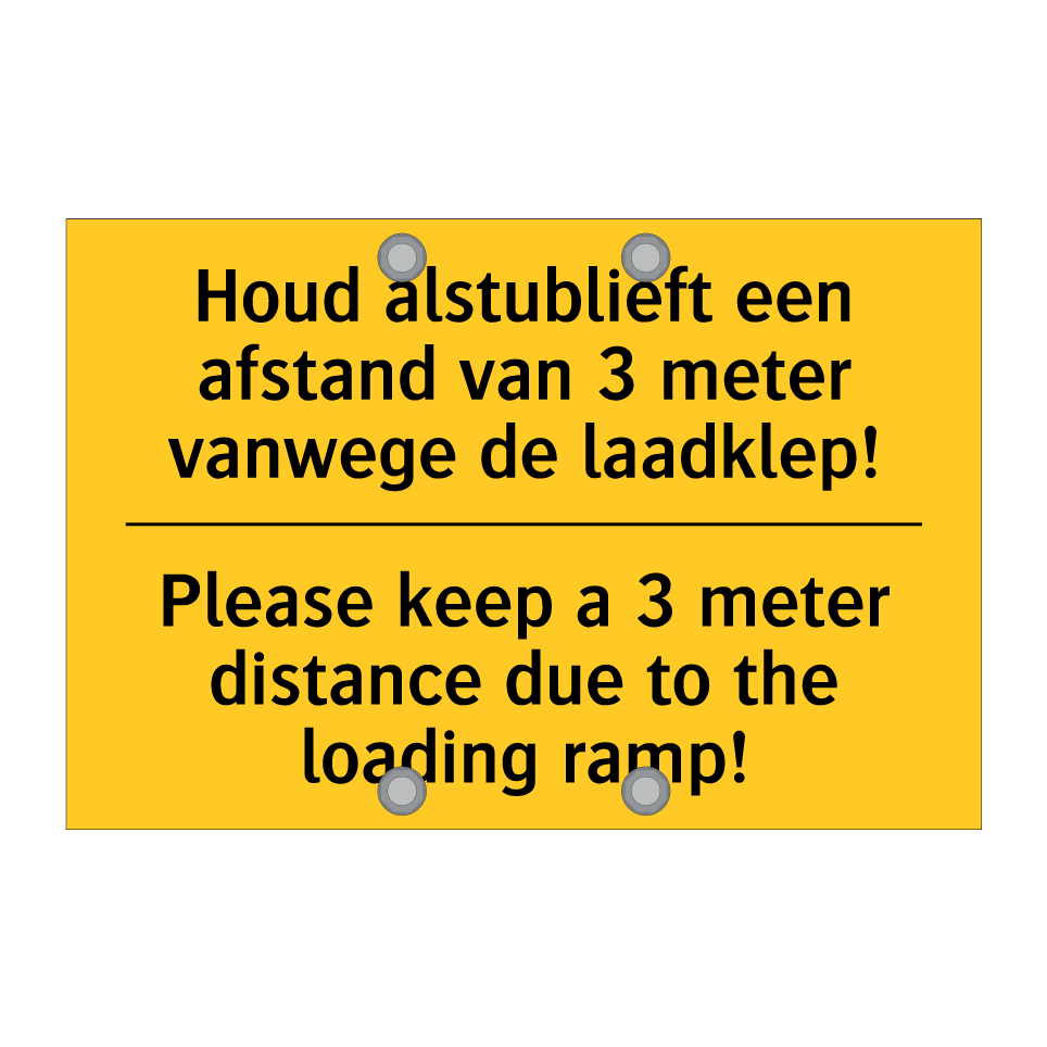Dit waarschuwingsbord met een gele achtergrond en zwarte tekst is ideaal voor gebruik in magazijnen, laadperrons en andere logistieke omgevingen. De tweetalige tekst in het Nederlands en Engels zorgt ervoor dat zowel lokale als internationale medewerkers de boodschap begrijpen, wat de veiligheid verhoogt. Plaats Dit bordje op goed zichtbare plekken waar laadkleppen worden gebruikt om ervoor te zorgen dat iedereen een veilige afstand van 3 meter houdt. Dit waarschuwingsbord helpt ongelukken te voorkomen en bevordert een veilige werkomgeving. Perfect voor drukke werkplekken waar duidelijke communicatie essentieel is.
